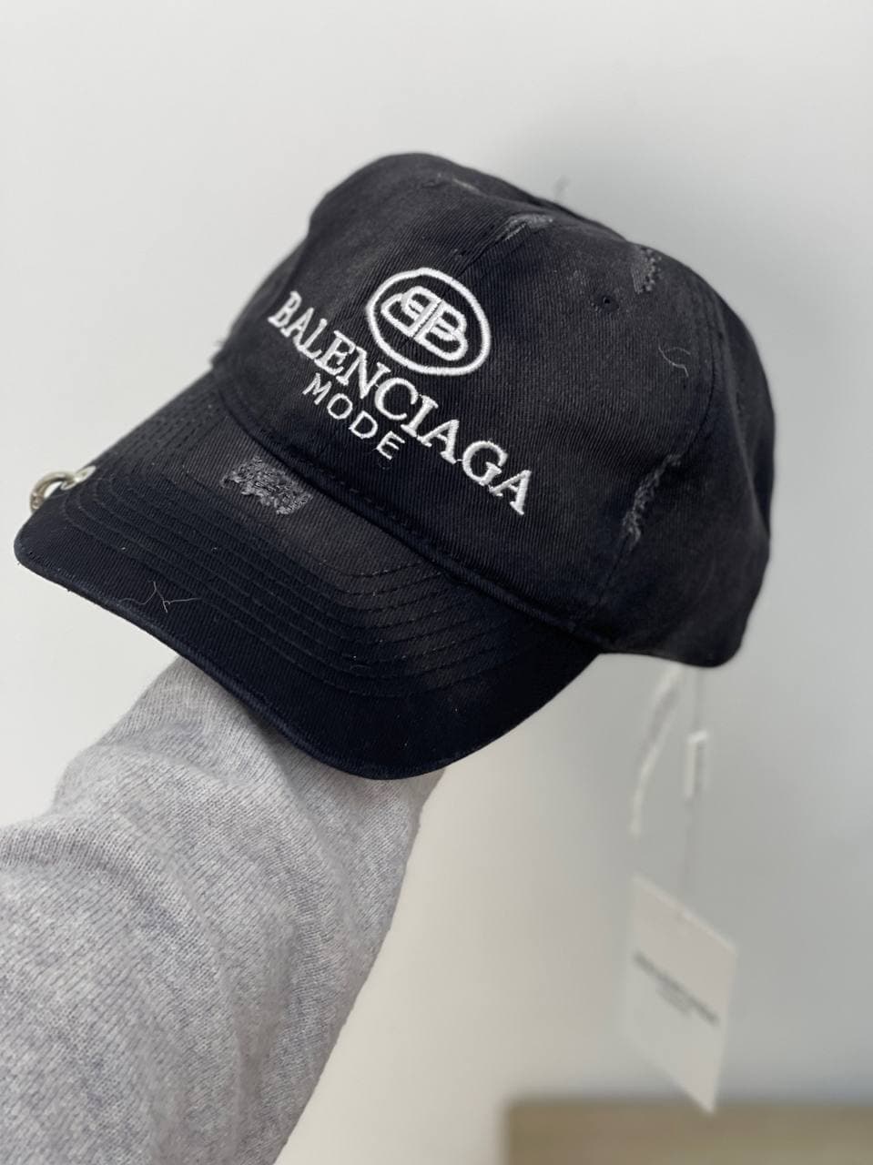 Стильная бейсболка Balenciaga LUX-58352 выполнена в классическом черном цвете, дополненная вышивкой логотипа бренда и надписью "MODE". Модель имеет винтажный вид благодаря эффекту потертости и декоративным кольцам, добавляя образу актуальности. Эта бейсболка станет отличным дополнением к повседневному гардеробу.