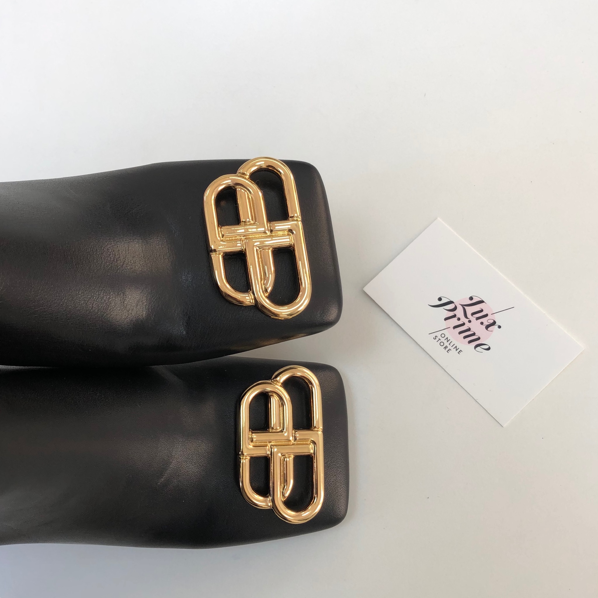 Ботильоны Balenciaga LUX-18832 — это элегантная и стильная обувь, идеально подходящая для современной женщины. Черный цвет и золотая фурнитура с узнаваемым логотипом бренда придают ботильонам роскошный вид. Устойчивый квадратный каблук обеспечивает комфорт при ходьбе, делая их подходящими как для дневных, так и для вечерних образов.