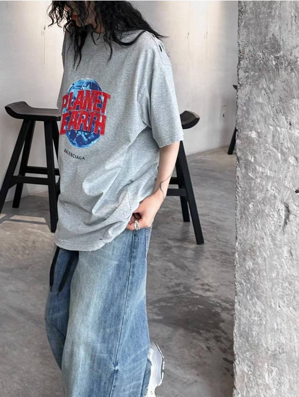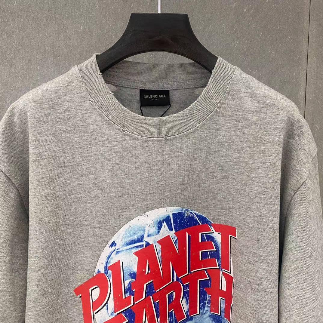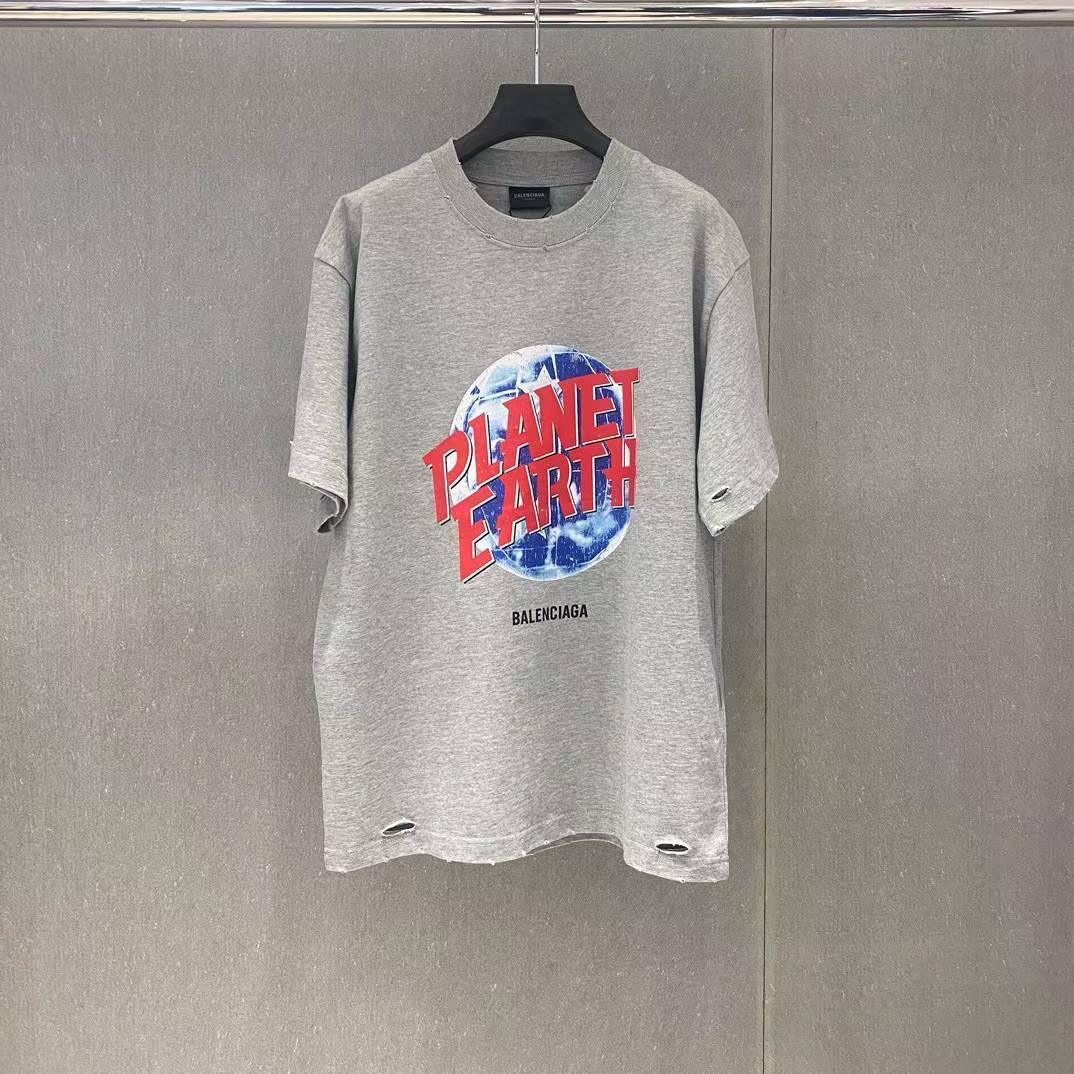 Футболка Balenciaga LUX-114067 – это стильный предмет гардероба от известного бренда. Серая футболка оверсайз с круглым вырезом и короткими рукавами. На груди яркий принт в виде надписи "PLANET EARTH" и логотипа бренда.