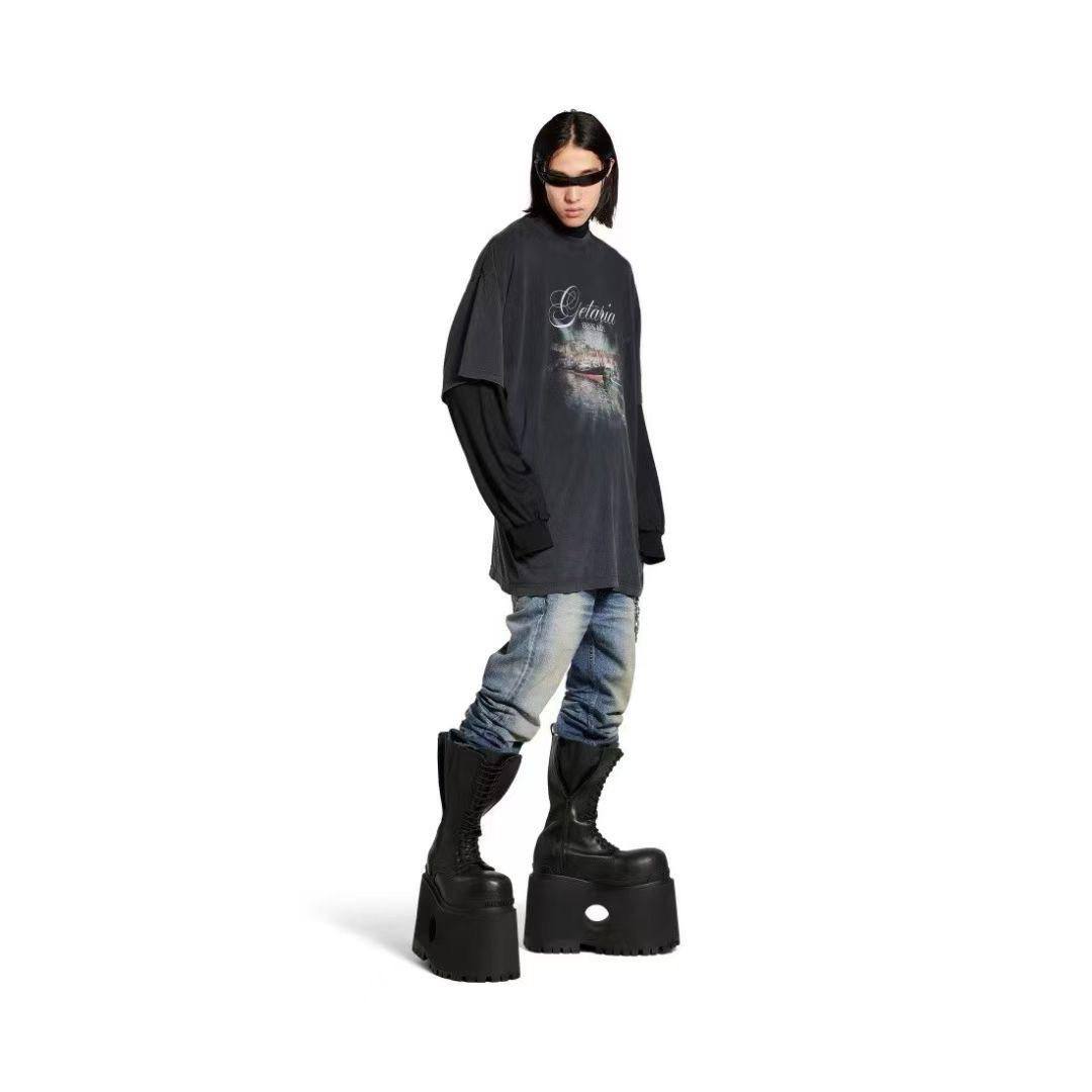 Футболка Balenciaga LUX-116752 – это стильный элемент гардероба в стиле casual. Темно-серая футболка с длинным рукавом, украшена принтом спереди. Такая футболка идеально подойдет для создания модных образов на каждый день.