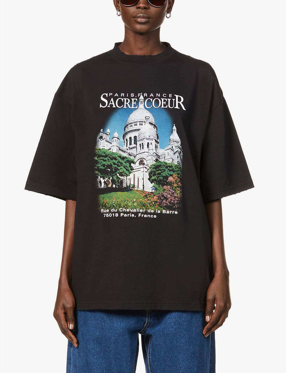 Футболка Balenciaga LUX-49308 — это стильное изделие, выполненное в современном кэжуал-стиле, с ярким принтом, изображающим базилику Сакре-Кёр в Париже. Дизайн футболки отражает элегантность и утонченность французской столицы, делая ее уникальным элементом гардероба.