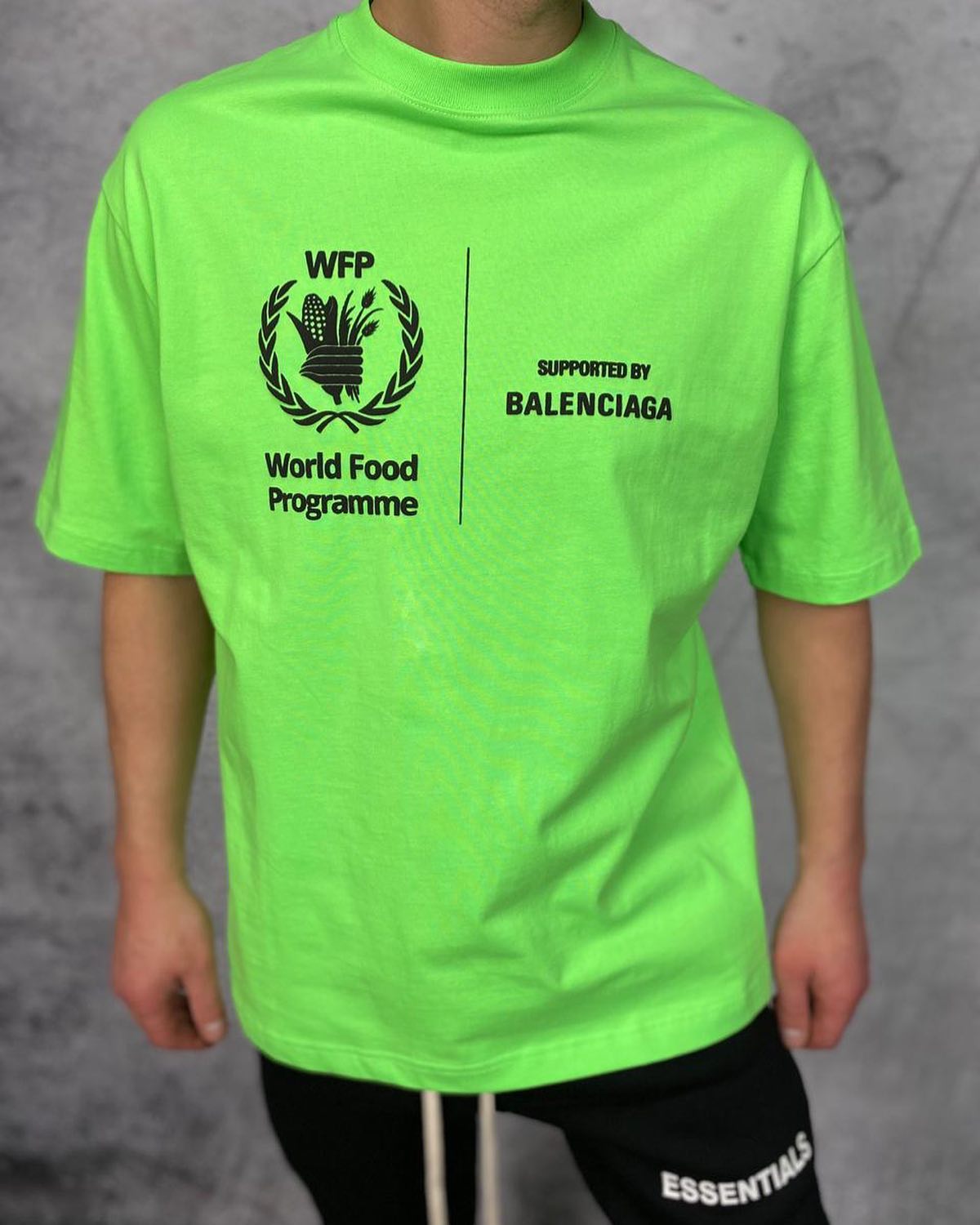 Эта мужская футболка Balenciaga LUX-42517 выполнена в ярком неоновом цвете, что делает ее эффектным элементом современного гардероба. Дизайн дополнен принтом с логотипом World Food Programme и надписью "SUPPORTED BY BALENCIAGA", подчеркивая социальную направленность и эксклюзивность модели. Классический прямой крой и короткие рукава обеспечивают комфорт в течение всего дня.