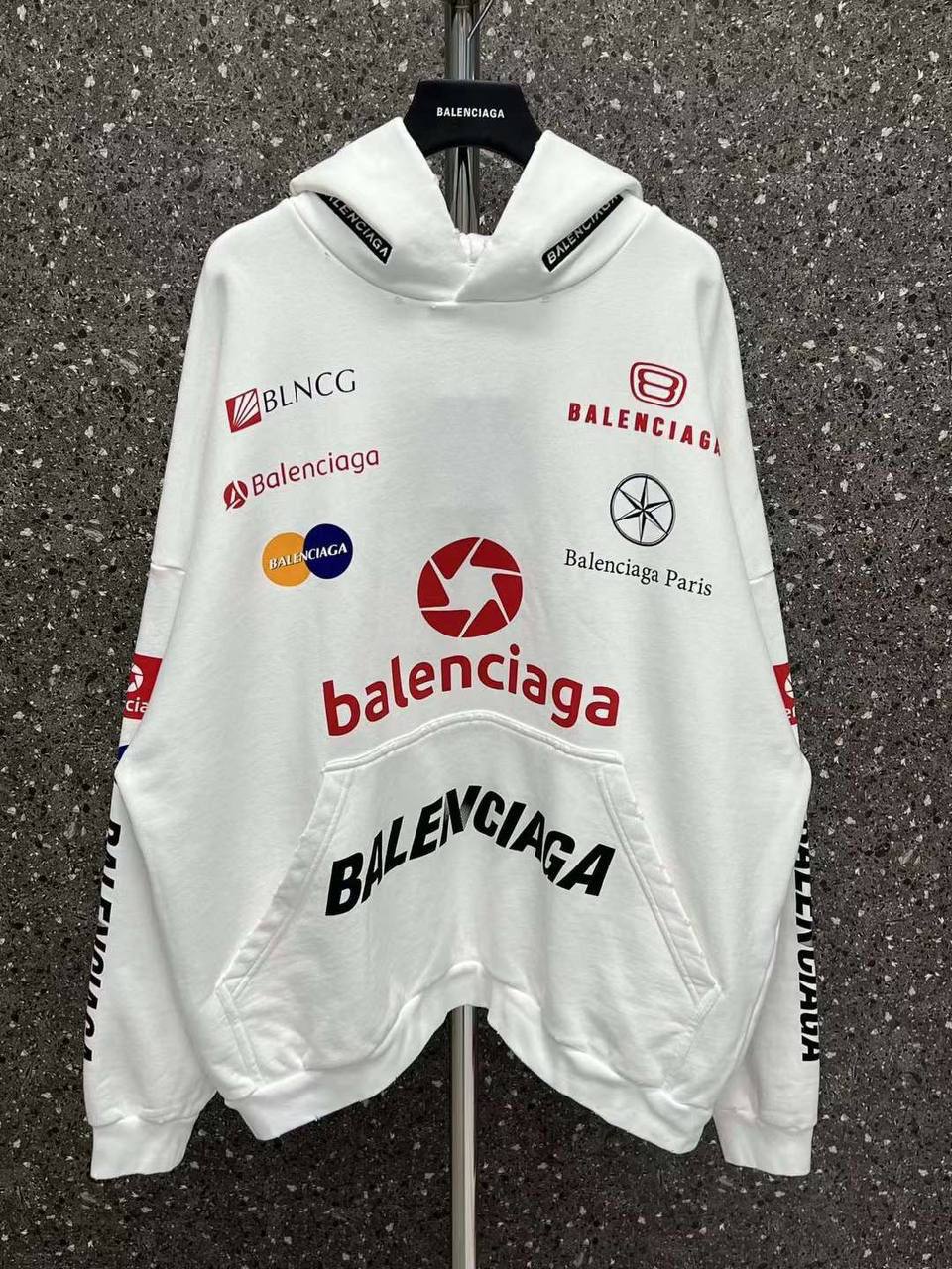 Худи Balenciaga LUX-95635 – это стильный предмет гардероба, выполненный в белом цвете с яркими логотипами и надписями. Худи имеет свободный крой с капюшоном и удобным карманом-кенгуру. Подходит для создания модных повседневных образов.