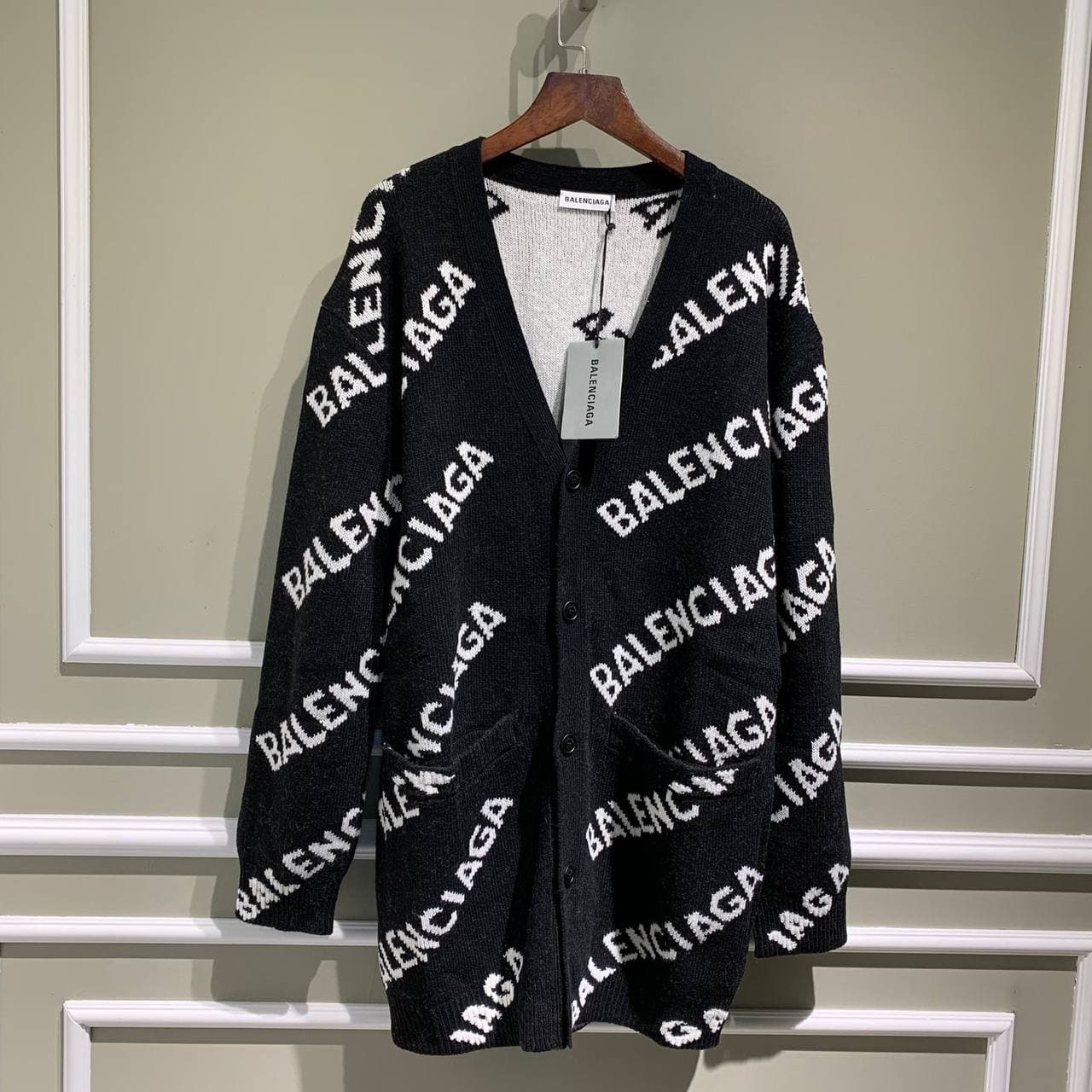 Этот кардиган Balenciaga LUX-56903 представляет собой стильное изделие с узнаваемым дизайном. Он выполнен в черном цвете с контрастным белым принтом логотипа бренда, расположенным по всей поверхности. Классический крой с V-образным вырезом и пуговицами делает его универсальным элементом гардероба.