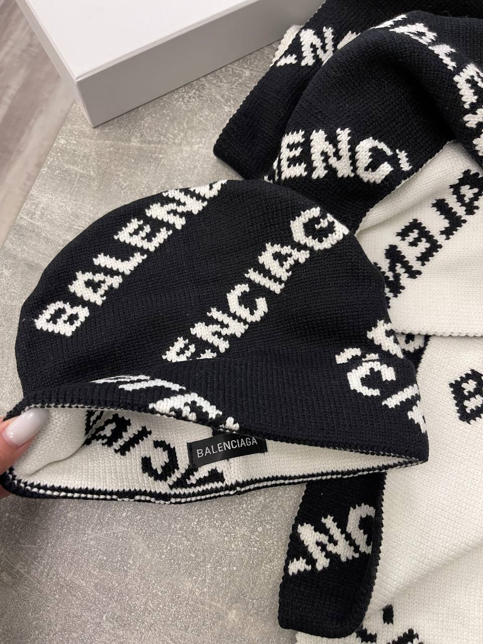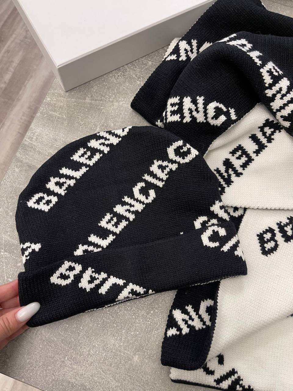 Комплект Balenciaga LUX-98864 — стильный аксессуар для холодной погоды, объединяющий шапку и шарф. Комплект выполнен в черном и белом цветах с повторяющимся логотипом бренда. Этот комплект идеально дополнит ваш образ, подчеркивая индивидуальность.