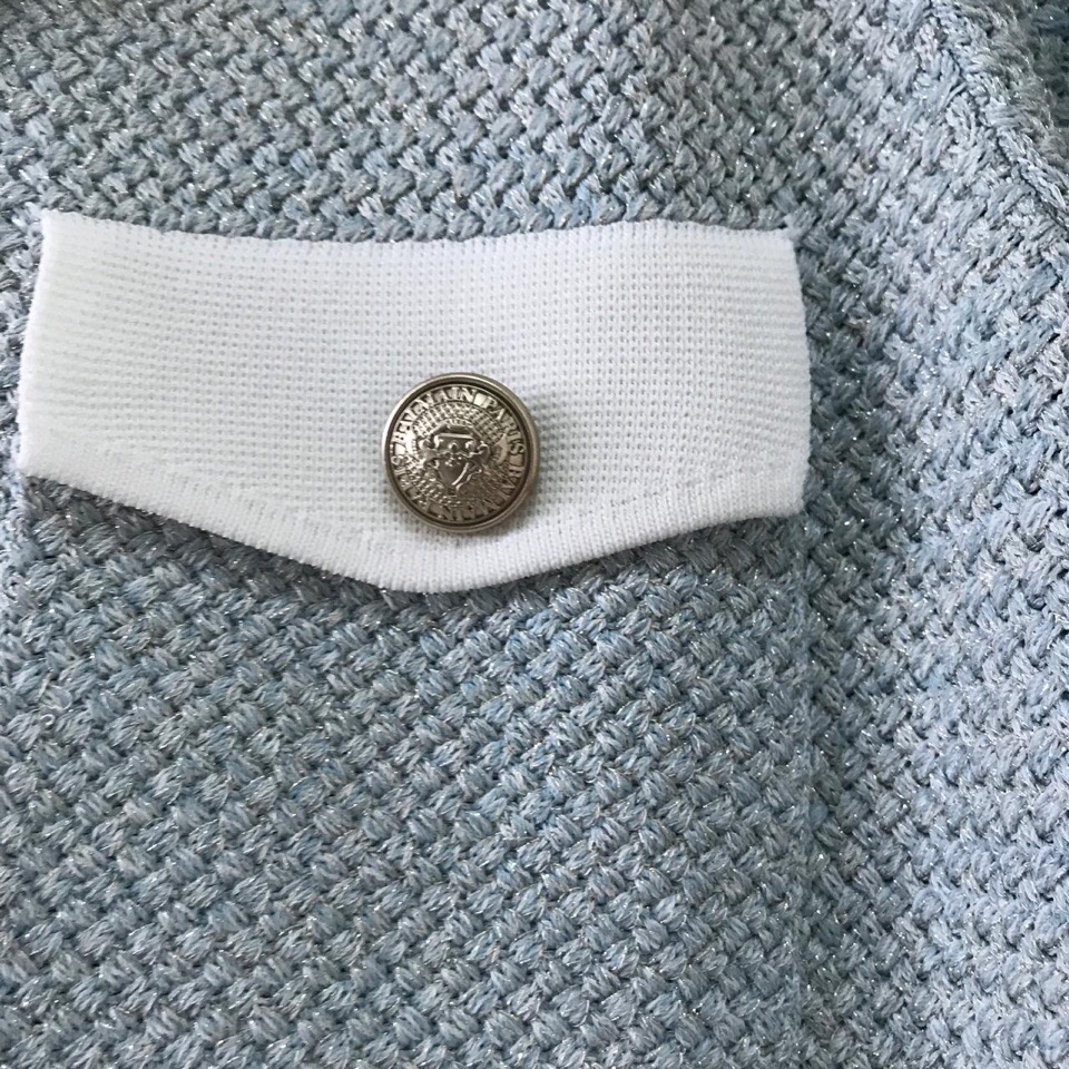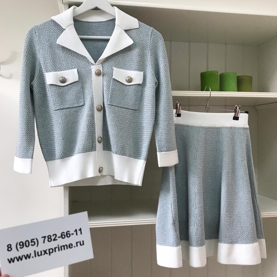 Костюм Balenciaga LUX-9214 представляет собой элегантный вязаный комплект, состоящий из кардигана и юбки. Этот стильный костюм в нежном голубом оттенке с контрастными белыми вставками создает образ, сочетающий в себе классику и современность, идеально подходит для создания изысканных повседневных и вечерних образов.