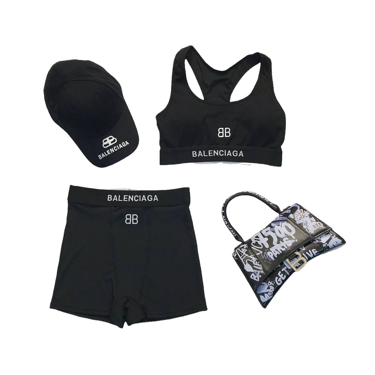 Представленный набор Balenciaga LUX-68907 – это комплект, состоящий из черной бейсболки, топа-бра, шорт и мини-сумочки. Вещи выполнены в спортивном стиле и декорированы узнаваемым логотипом бренда. Этот набор идеально подойдет для создания стильных повседневных образов или для занятий спортом.