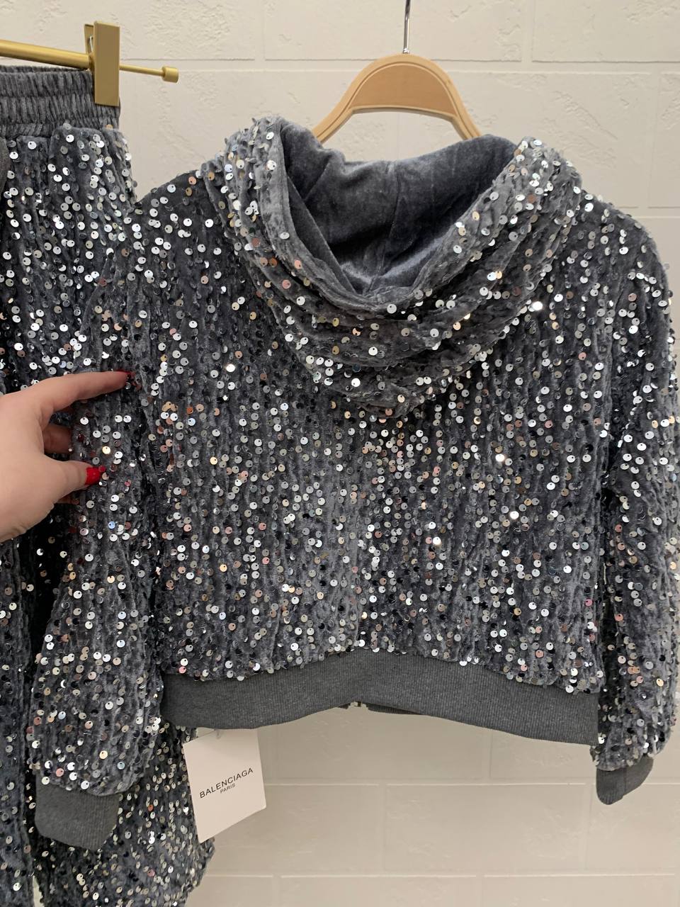 Костюм Balenciaga LUX-108932 — это воплощение смелого стиля и современной элегантности. Комплект, состоящий из худи на молнии и брюк, выполнен в мерцающем серебристом цвете, что создает эффектный и запоминающийся образ. Этот костюм идеально подходит для создания ярких и запоминающихся образов.
