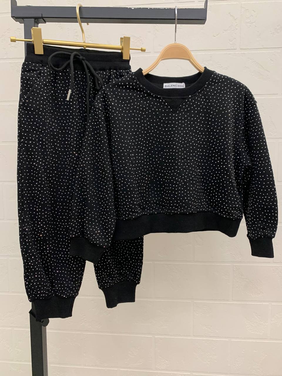 Костюм Balenciaga LUX-108935 — это стильный комплект для создания элегантного образа. Костюм состоит из свитшота и брюк черного цвета, декорированного множеством мелких белых деталей, создающих эффект мерцания. Он идеально подойдет для повседневной носки, а также для создания нарядных образов.