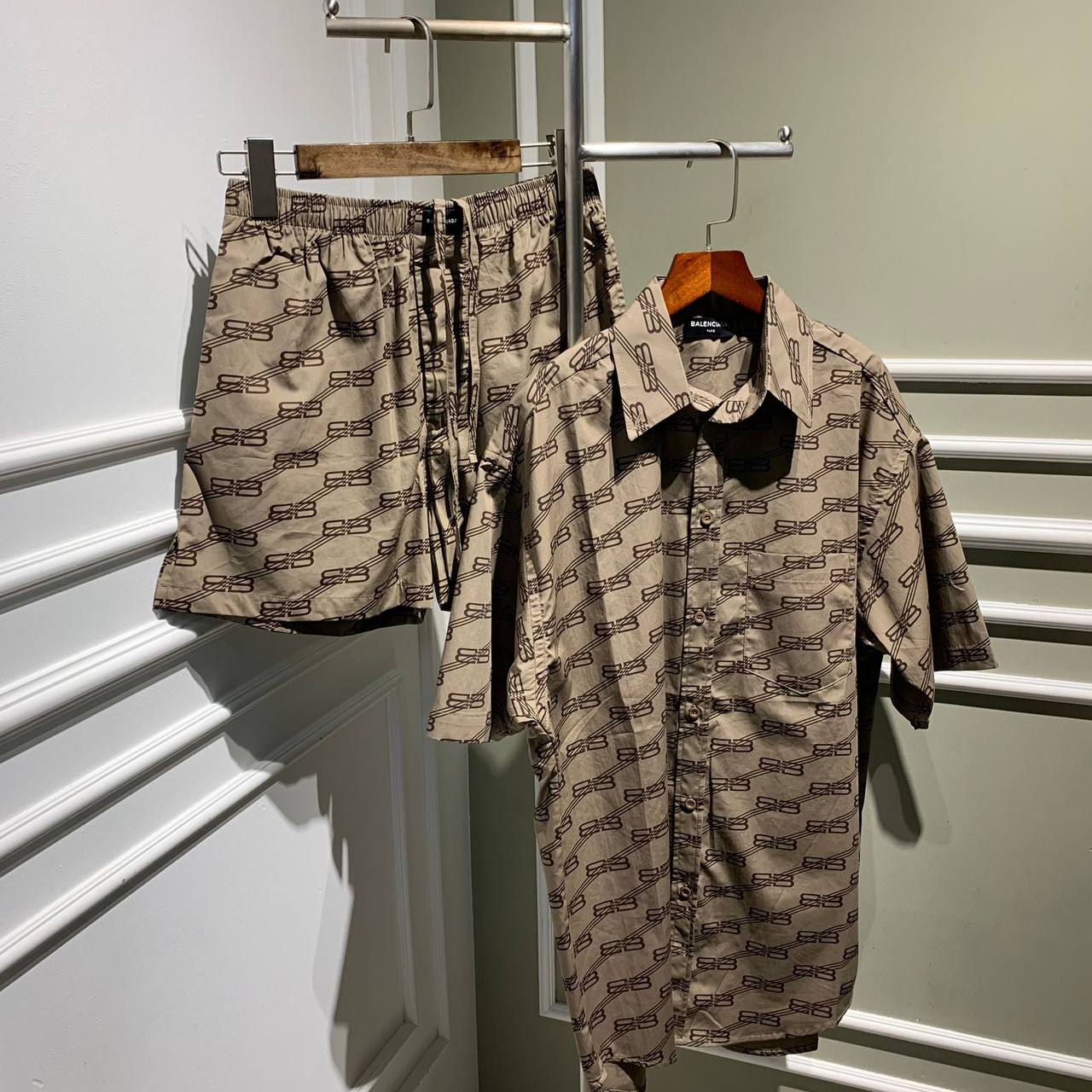 Костюм женский Balenciaga LUX-73914 представляет собой стильный комплект в фирменном стиле бренда. Костюм состоит из рубашки с коротким рукавом и шорт, выполненных в песочном цвете с повторяющимся логотипом бренда. Этот ансамбль идеально подходит для создания летних образов, сочетая в себе комфорт и узнаваемый дизайн.