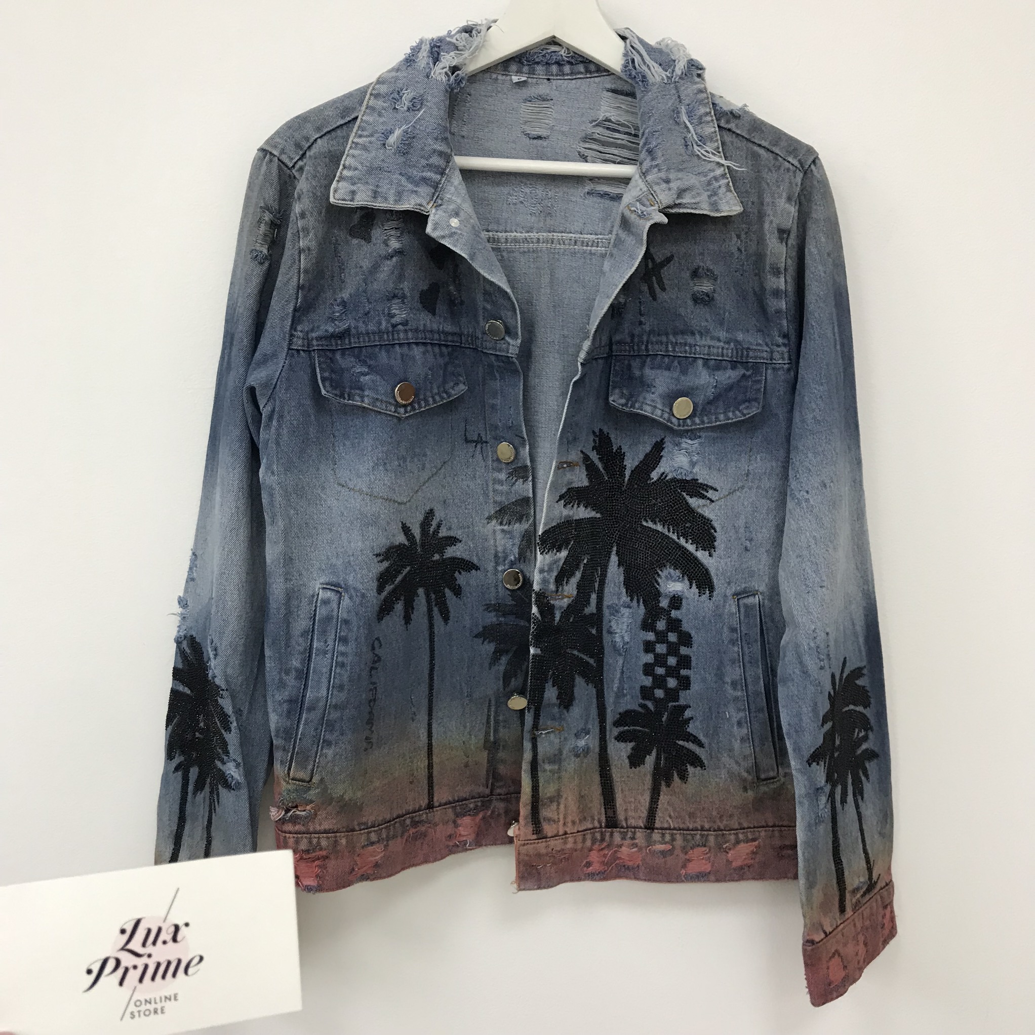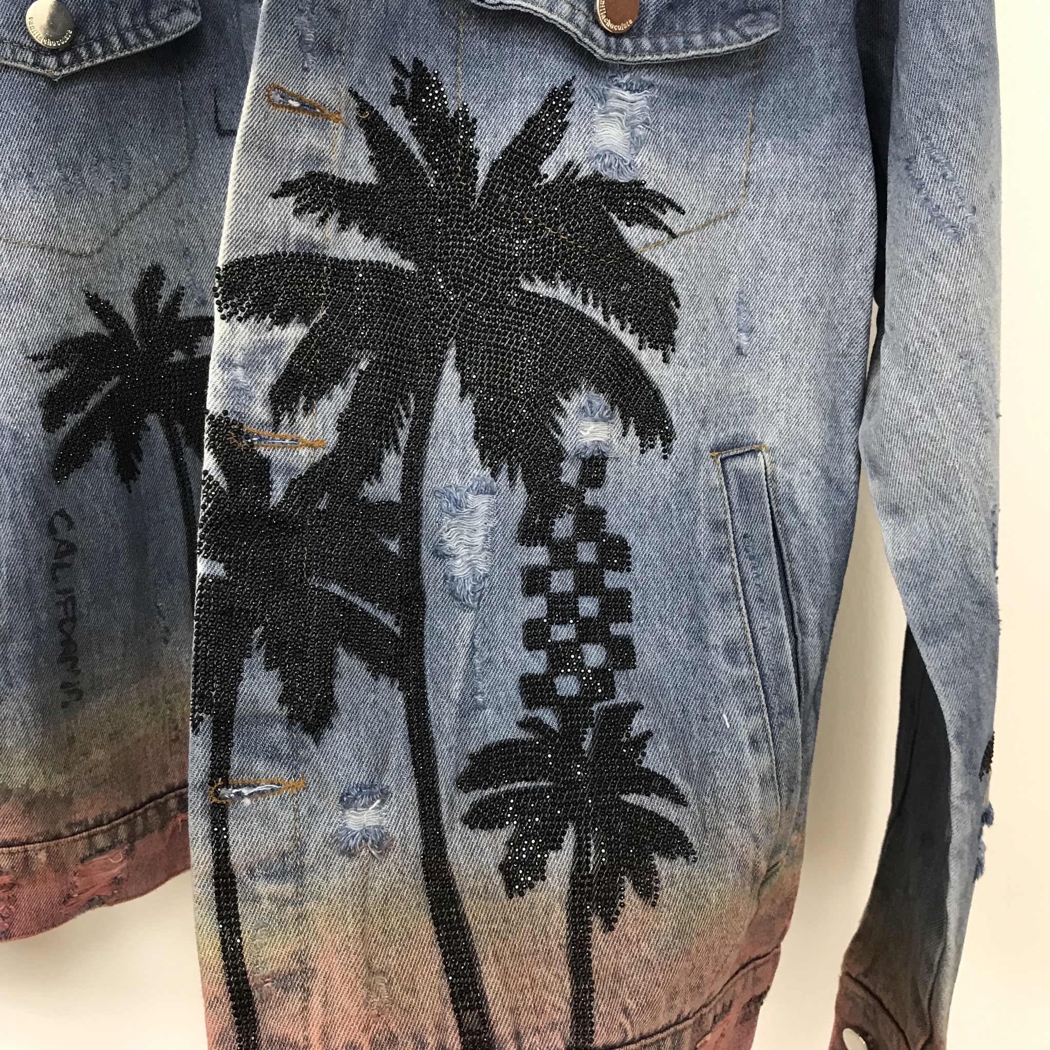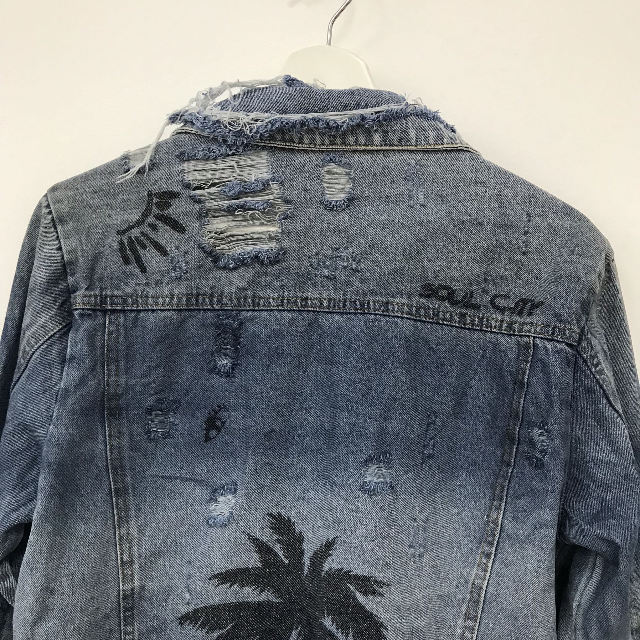 Эта женская джинсовая куртка Balenciaga LUX-17601 выполнена в стиле оверсайз и украшена эффектным принтом с пальмами, дополненным бусинами. Дизайн изделия включает элементы гранжа: потертости, рваные края и декоративные разрывы, что придает ей уникальный и дерзкий вид. Куртка прекрасно подойдет для создания стильных уличных образов.
