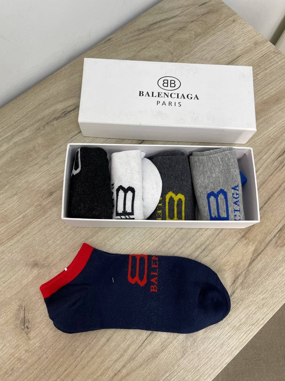 Эти носки Balenciaga LUX-56548, представленные в подарочной упаковке, демонстрируют современный стиль бренда. В наборе представлены носки различных расцветок: черные, белые, серые и темно-синие, каждый с узнаваемым логотипом. Они идеально подойдут для повседневного ношения, добавляя стильный акцент к любому образу.