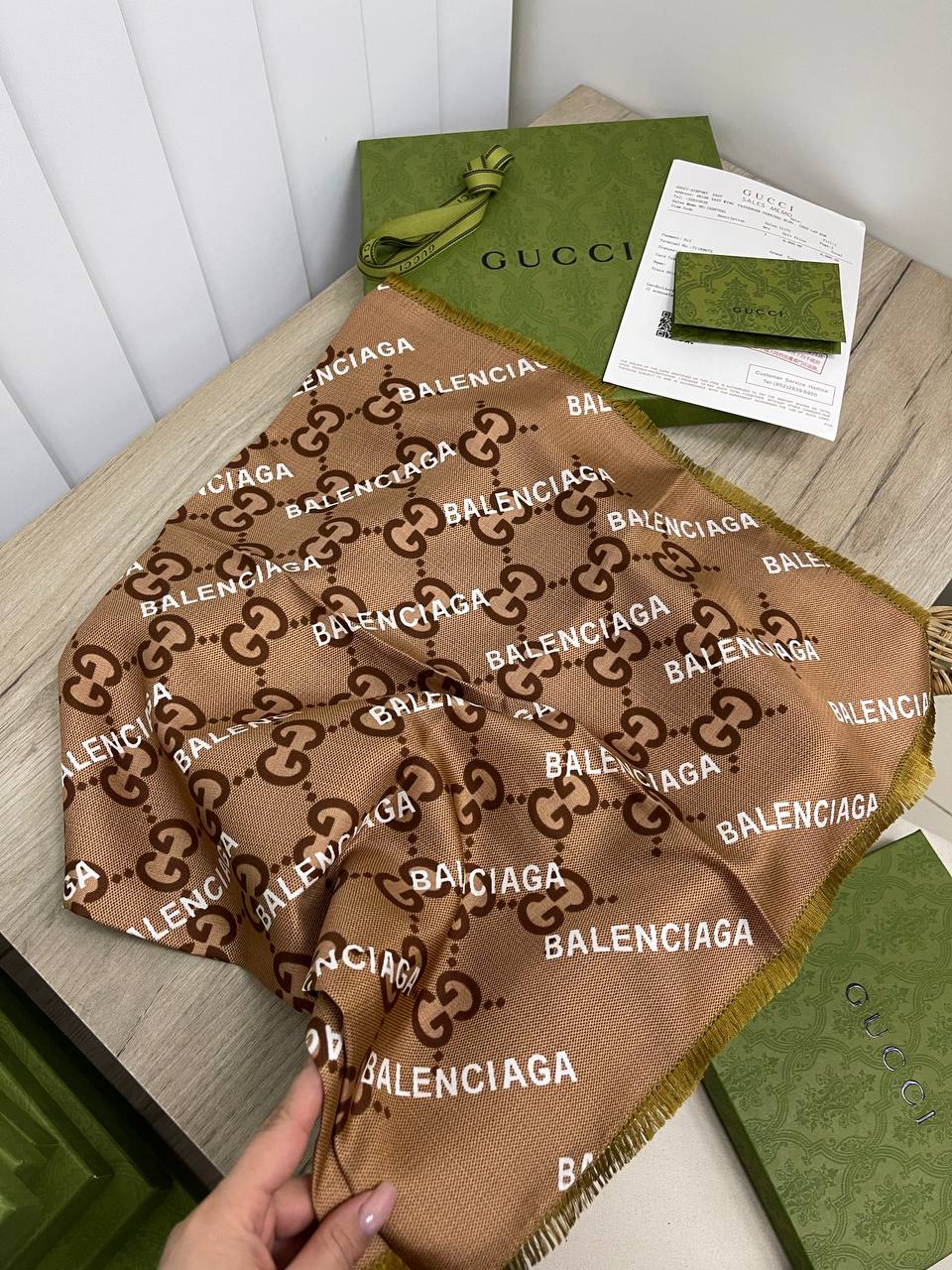 Шелковый платок Balenciaga с узнаваемым принтом Gucci в коричневых тонах, украшенный монограммой бренда и логотипом Balenciaga, является стильным аксессуаром. Этот роскошный платок станет изысканным дополнением к любому образу, добавляя ему элегантности и шика.