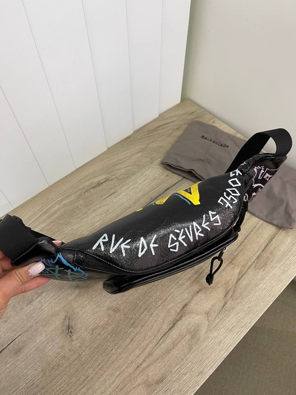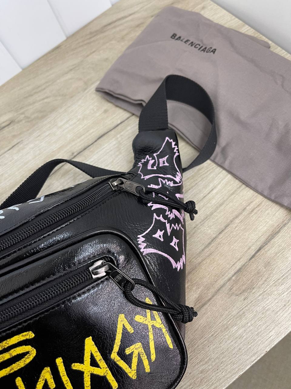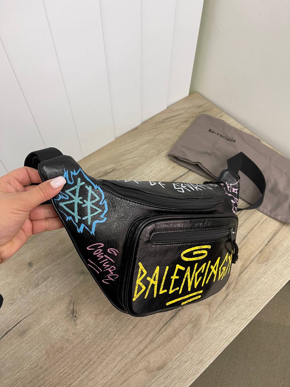 Поясная сумка Balenciaga LUX-86370 — стильный аксессуар, который подчеркнет индивидуальность. Черный цвет сумки делает ее универсальной, а граффити-дизайн добавляет нотку бунтарства и эксклюзивности. Сумка подойдет как для повседневных прогулок, так и для вечеринок.