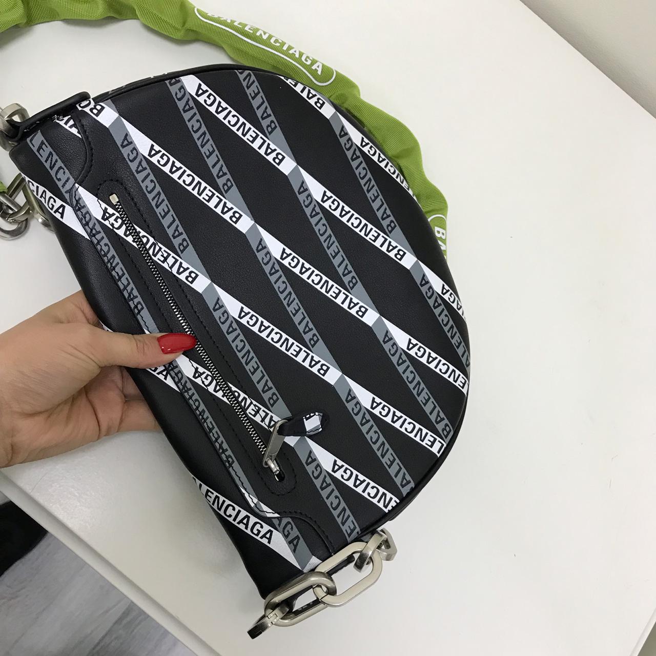 Поясная сумка Balenciaga LUX-11300 представляет собой стильный и функциональный аксессуар. Ее дизайн сочетает классическую форму поясной сумки с современными элементами, такими как яркий текстильный ремень с логотипом бренда и массивная металлическая цепь. Черный цвет сумки с диагональными полосами, украшенными белым и серым логотипом Balenciaga, придает ей узнаваемый и модный вид.