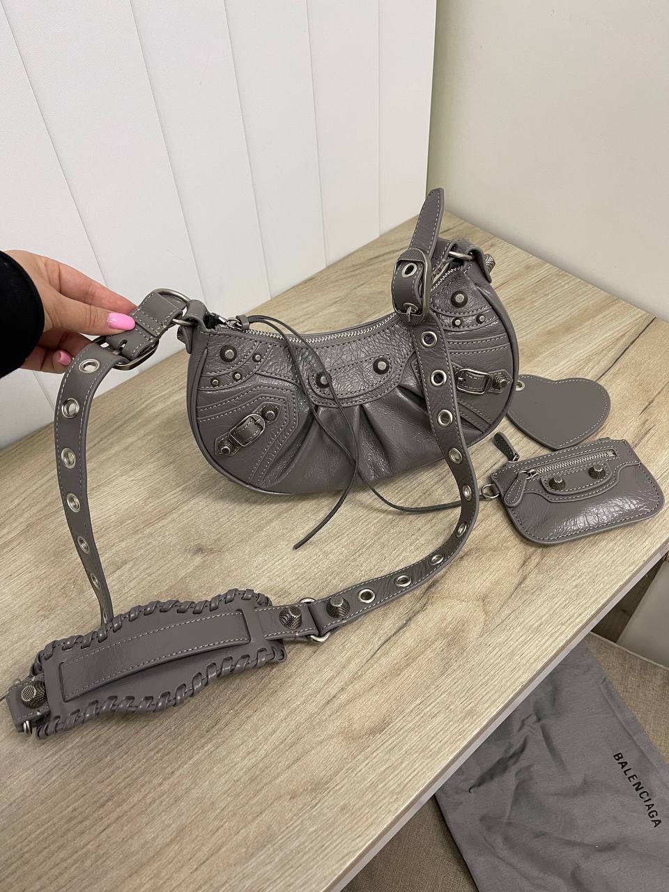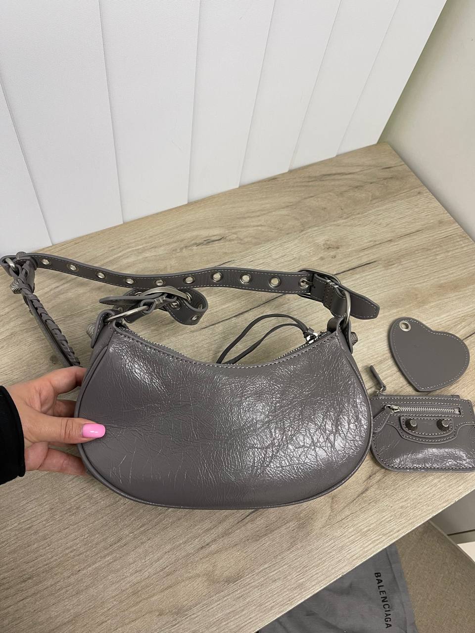 Сумка женская 25 см Balenciaga LUX-85727 - это элегантная сумка, выполненная в узнаваемом стиле Balenciaga. Сумка имеет насыщенный серый цвет, что придает ей универсальность и позволяет сочетать с различными образами. Ее изогнутая форма и декоративные элементы создают современный и утонченный вид.