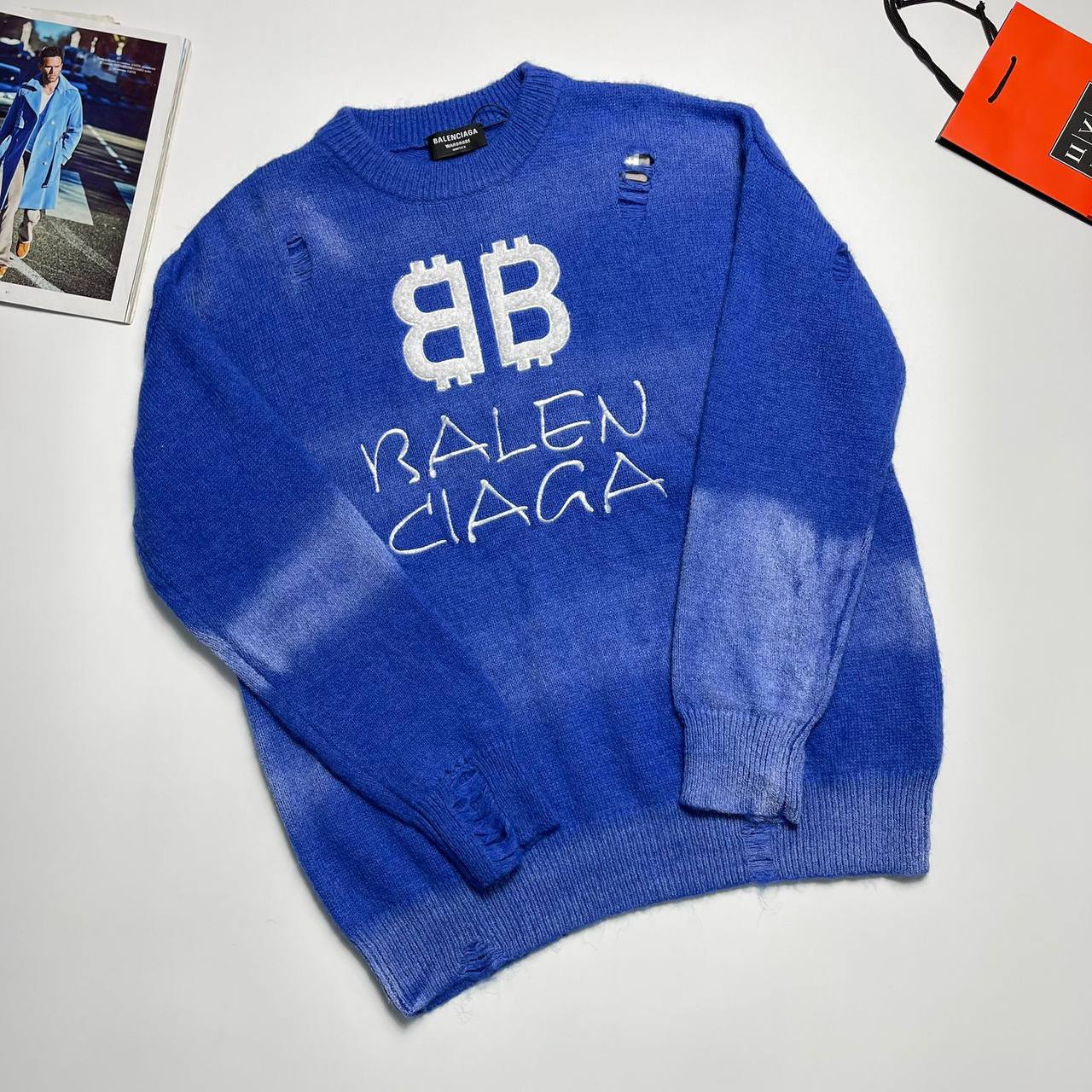 Свитер мужской Balenciaga LUX-99227 — это воплощение смелого стиля и уличной моды. Свитер выполнен в насыщенном синем цвете с эффектом потертости и белым логотипом. Элементы дизайна придают ему уникальный и узнаваемый вид.