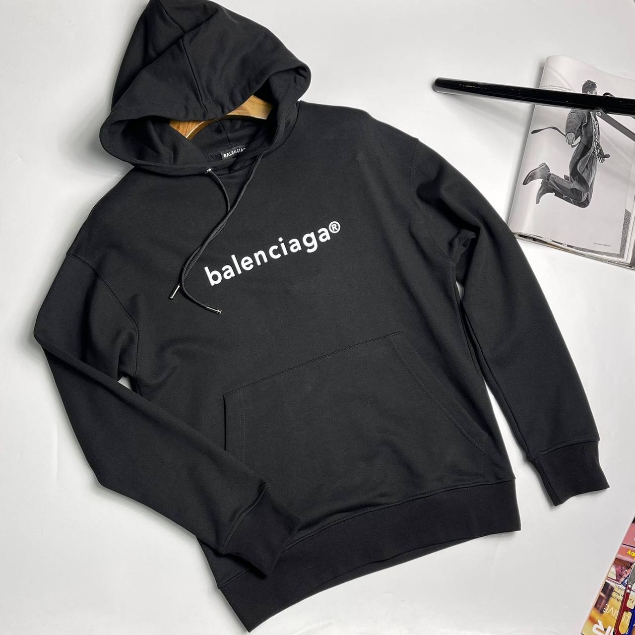 Толстовка Balenciaga LUX-77957 - это стильная черная толстовка с капюшоном, воплощающая в себе современный городской стиль. Характерной чертой является контрастный белый логотип бренда на груди. Эта толстовка идеально подходит для создания повседневных, но модных образов.