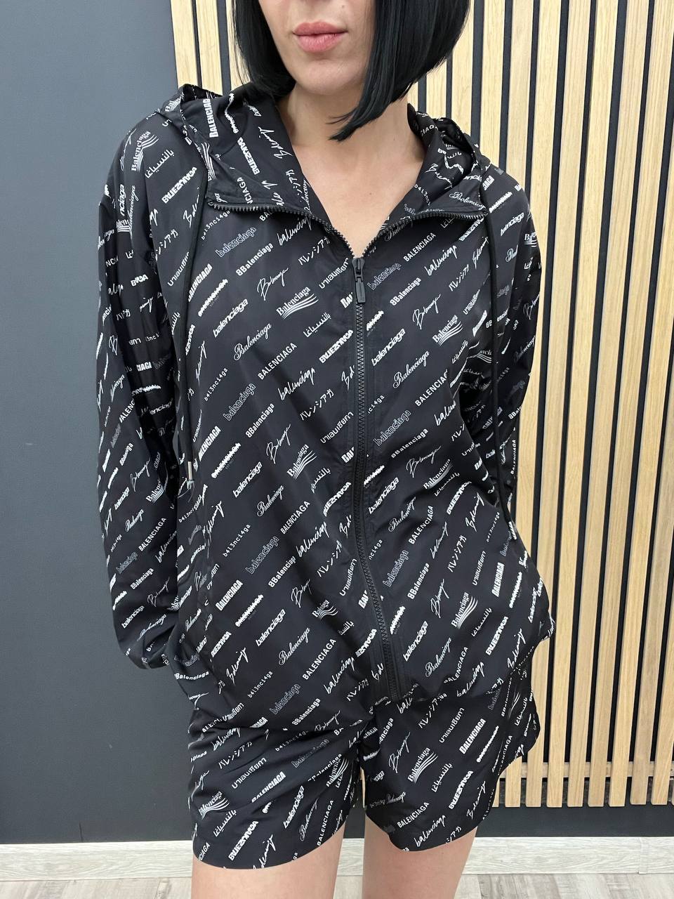 Ветровка Balenciaga LUX-106878 - это стильная черная ветровка с капюшоном и принтом логотипа бренда по всей поверхности. Комплект ветровки включает короткие шорты, что делает его идеальным вариантом для создания спортивного образа. Ветровка сшита из прочного материала, который хорошо защищает от ветра и небольшого дождя.