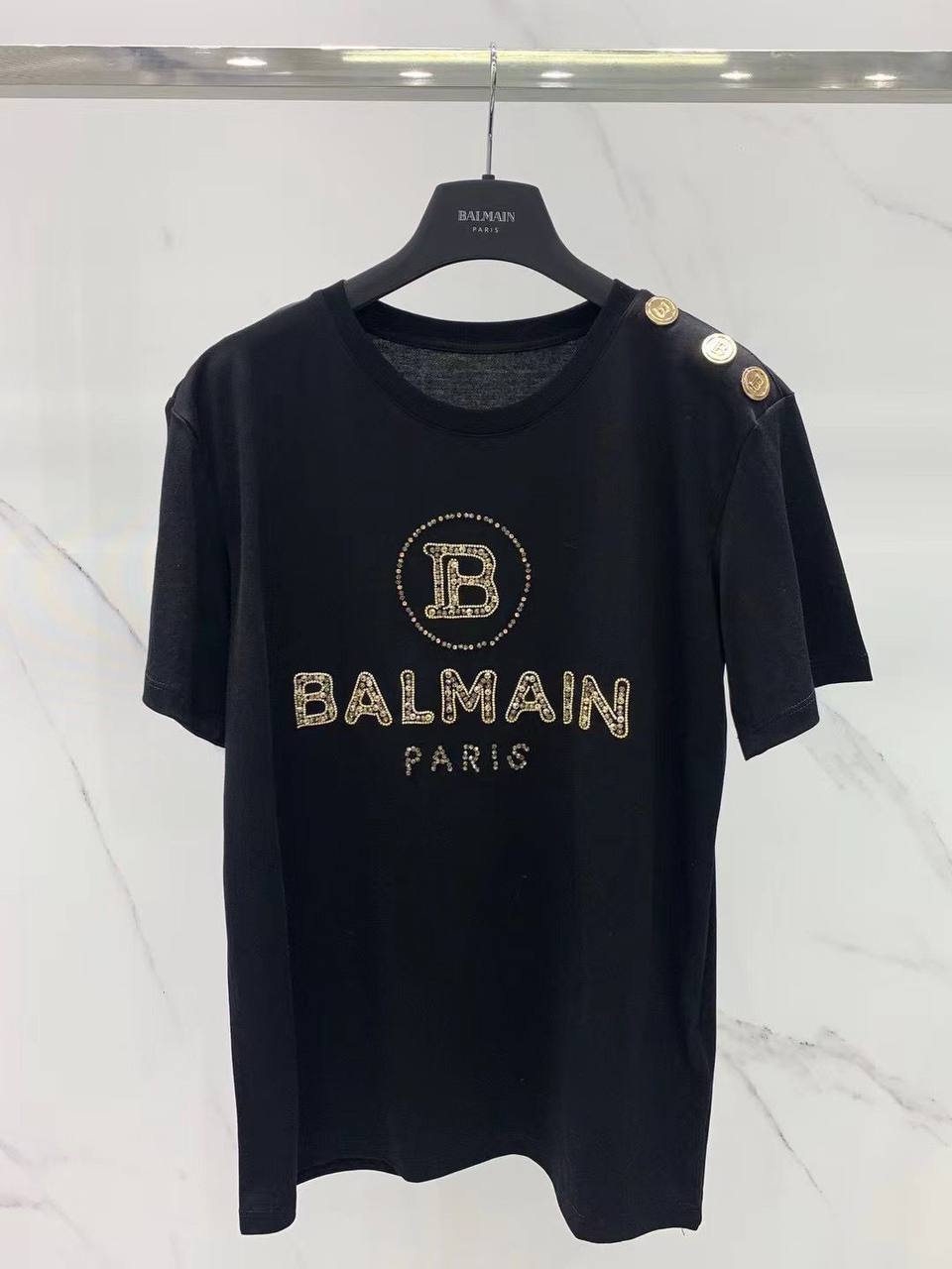Футболка женская Balmain LUX-65315 – это элегантный предмет гардероба, который сочетает в себе спортивный стиль и изысканный дизайн. Черный цвет и классический крой делают ее универсальной, а декоративные элементы в виде страз и пуговиц с логотипом бренда придают ей особый шарм. Эта модель прекрасно подойдет для создания как повседневных, так и более нарядных образов.
