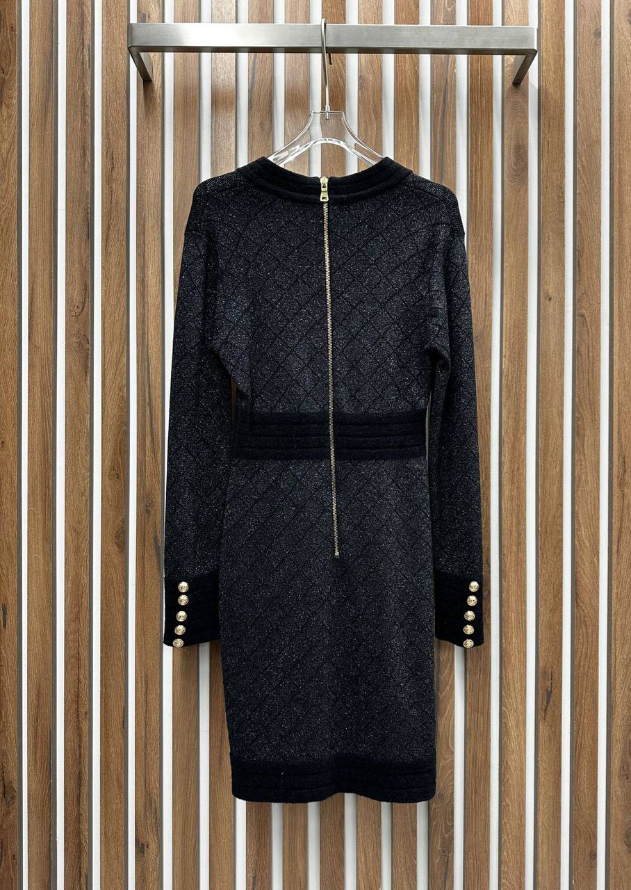 Платье Balmain LUX-100100 – элегантное платье с длинными рукавами, выполнено в классическом стиле. Черный цвет платья с блестящей текстурой создает привлекательный образ. Подходит для различных мероприятий, от деловых встреч до вечерних выходов.