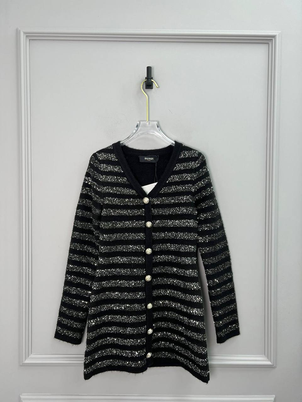 Платье Balmain LUX-113219 — элегантное платье черного цвета в полоску с блестящими вставками, которое подойдет для создания стильных образов. Элегантный кардиган с золотыми пуговицами. Идеально дополнит вечерний гардероб.