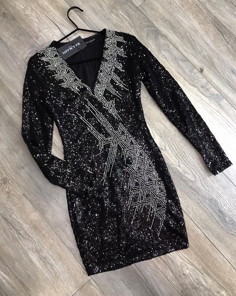 Это элегантное платье Balmain LUX-25614, выполненное в облегающем силуэте, станет идеальным выбором для особых случаев. Модель с глубоким V-образным вырезом и длинными рукавами украшена эффектной россыпью пайеток черного цвета, мерцающих при каждом движении. Оригинальный геометрический узор из серебристых бусин и страз, расположенный на лифе и передней части платья, придает ему роскошный и неповторимый вид.