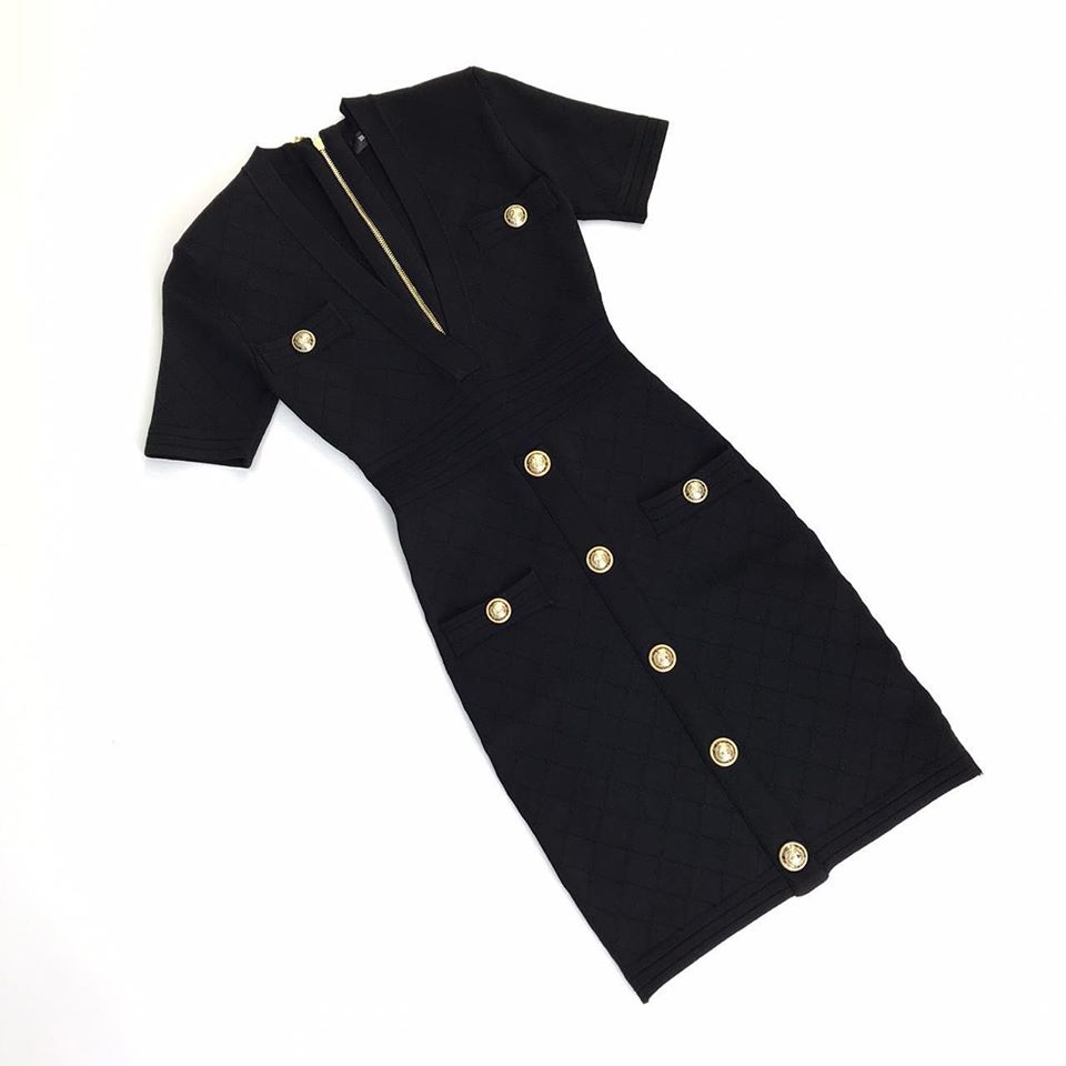 Это элегантное черное платье Balmain LUX-26685 с короткими рукавами и V-образным вырезом, украшенное золотистыми пуговицами и молнией, является воплощением роскоши и утонченности. Приталенный силуэт и фактурный узор делают его идеальным выбором для особых случаев или для создания стильного образа в повседневной жизни.