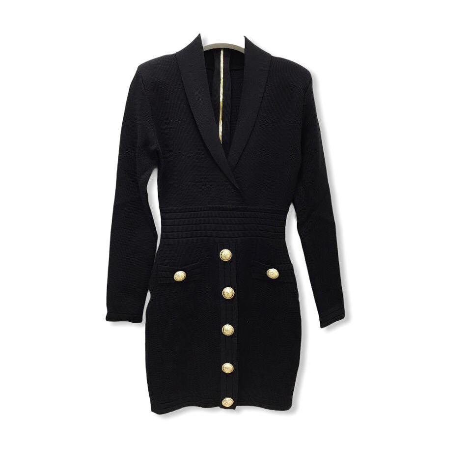 Платье Balmain LUX-41246 представляет собой элегантное трикотажное платье черного цвета, выполненное в стиле, напоминающем строгий пиджак. Оно идеально подчеркивает фигуру, создавая изысканный и уверенный образ. Глубокий V-образный вырез, акцентированная талия и золотистые пуговицы добавляют платью роскоши и шика.