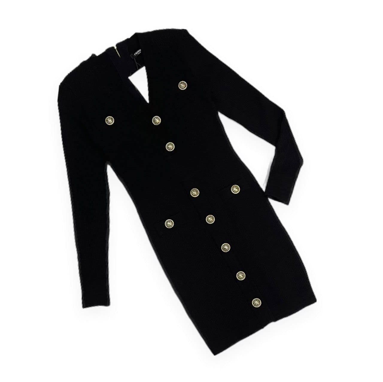 Изысканное трикотажное платье Balmain LUX-56725 черного цвета с длинными рукавами и V-образным вырезом. Это элегантное платье украшено золотистыми пуговицами, расположенными в два ряда, что придает ему классический и утонченный вид. Модель идеально подчеркивает фигуру, создавая женственный силуэт.