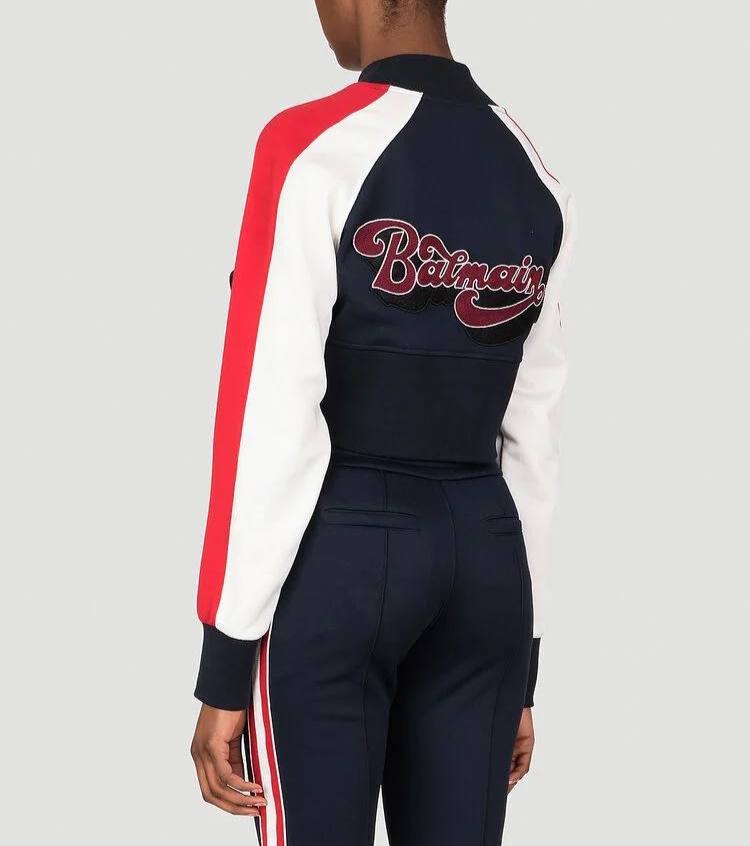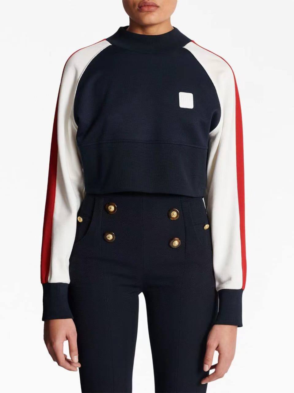 Свитшот Balmain LUX-96382 – это стильный предмет гардероба, сочетающий в себе спортивный шик и элегантность. Модель выполнена в классической цветовой гамме: темно-синий основной цвет дополнен белыми и красными деталями на рукавах. Свитшот имеет короткий крой и воротник-стойку.