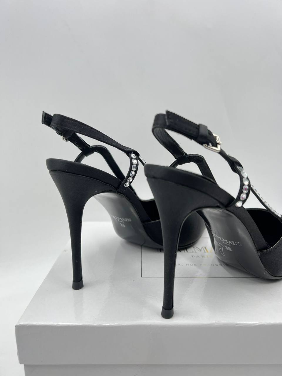 Туфли женские Balmain LUX-82486 - это элегантная обувь, сочетающая в себе изысканный дизайн и утонченность. Черный цвет туфель придает им классический вид, подчеркивая их универсальность. Дизайн включает в себя тонкий каблук и декор в виде страз, расположенных на ремешке, создавая роскошный акцент.