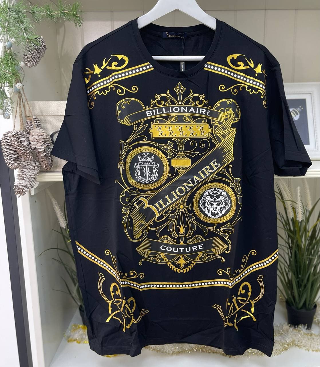 Футболка Billionaire LUX-60502 представляет собой стильное решение для создания эффектного образа. Черная футболка украшена роскошным золотым принтом с элементами геральдики, изображениями льва и надписями "BILLIONAIRE" и "COUTURE". Эта модель идеально подойдет для тех, кто ценит эксклюзивность и премиальное качество.