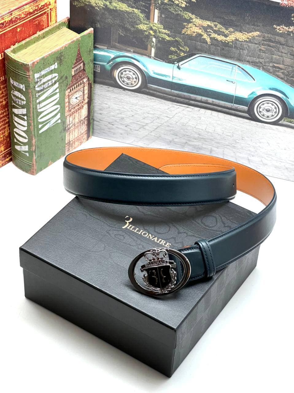 Ремень Billionaire LUX-62797 представляет собой элегантный аксессуар, выполненный в классическом стиле. Его двусторонняя конструкция, с темным синим верхом и ярко-оранжевой подкладкой, добавляет изысканности и универсальности. Акцент делается на высококачественные материалы и внимание к деталям, что характерно для бренда Billionaire.