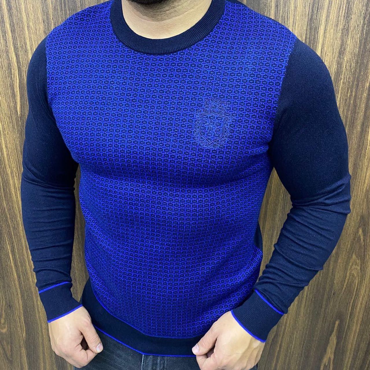 Мужской свитер Billionaire LUX-39235 представляет собой стильный и элегантный элемент гардероба. Этот джемпер с круглым вырезом и длинными рукавами выполнен в глубоком синем цвете с контрастным геометрическим узором на передней части. Он идеально подходит для создания как повседневных, так и более формальных образов, добавляя нотку роскоши.