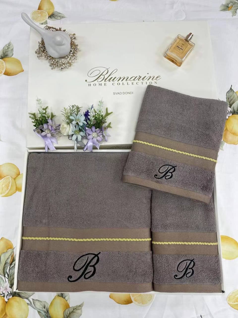 Комплект из трёх полотенец Blumarine LUX-60389 выполнен в элегантном стиле, подчеркивая роскошь и изысканность бренда. Серый цвет полотенец, украшенных монограммой "B" и декоративными полосами, придает им особый шарм. Этот комплект станет прекрасным дополнением к ванной комнате или идеальным подарком.