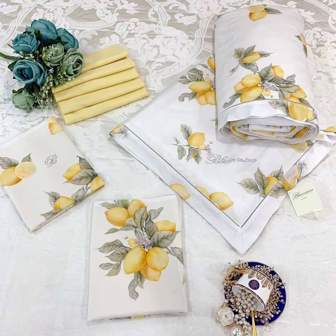 Комплект постельного белья Blumarine LUX-71262 представляет собой изысканный текстиль для спальни, выполненный в элегантном стиле. Этот комплект включает в себя элементы с цветочным принтом с лимонами и логотипом бренда. Белоснежный фон контрастирует с яркими элементами, создавая свежий и привлекательный вид.