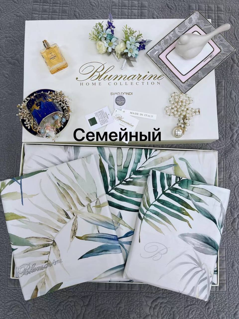 Комплект постельного белья Blumarine СЕМЕЙНЫЙ LUX-67290 - это элегантное решение для вашей спальни, выполненное в роскошном стиле Blumarine Home Collection. Дизайн комплекта вдохновлен природой, с живописным изображением тропических листьев в акварельных тонах, что придает ему изысканность и свежесть. Этот комплект станет центральным элементом интерьера, добавляя нотку утонченности и комфорта.