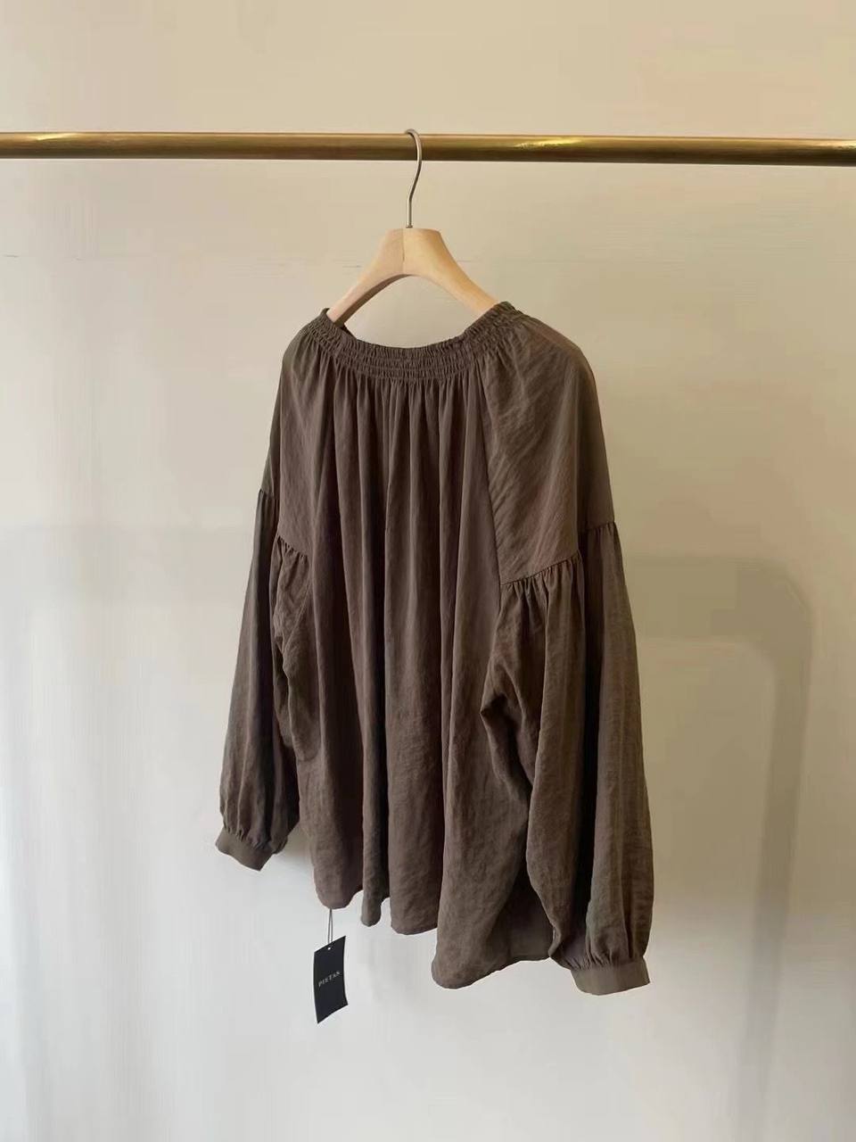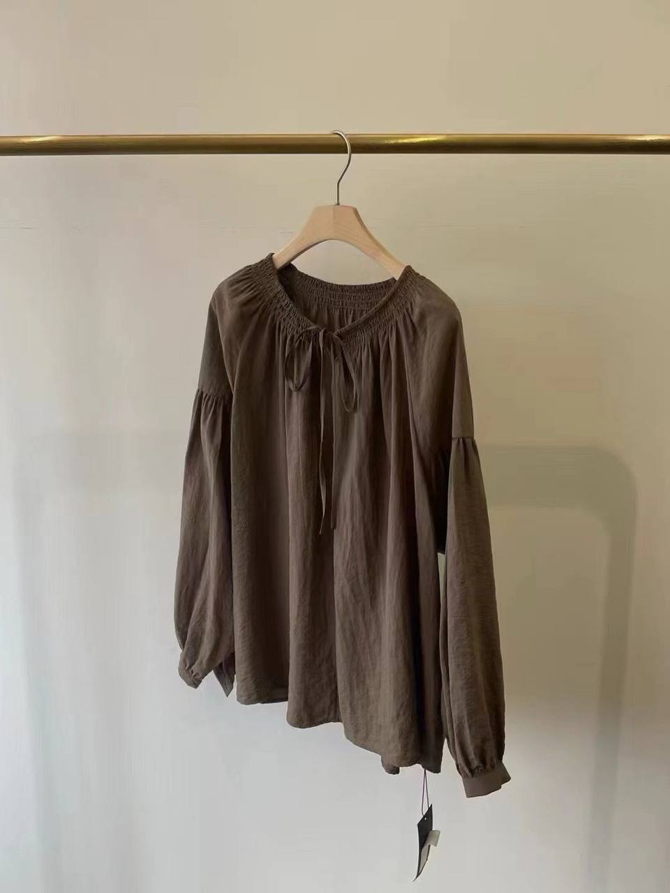 Блузка LUX-118102 представляет собой элегантный предмет гардероба в классическом стиле. Она выполнена в глубоком коричневом оттенке с текстурной поверхностью. Блузка имеет свободный крой, длинные рукава с манжетами и небольшой вырез с завязками.