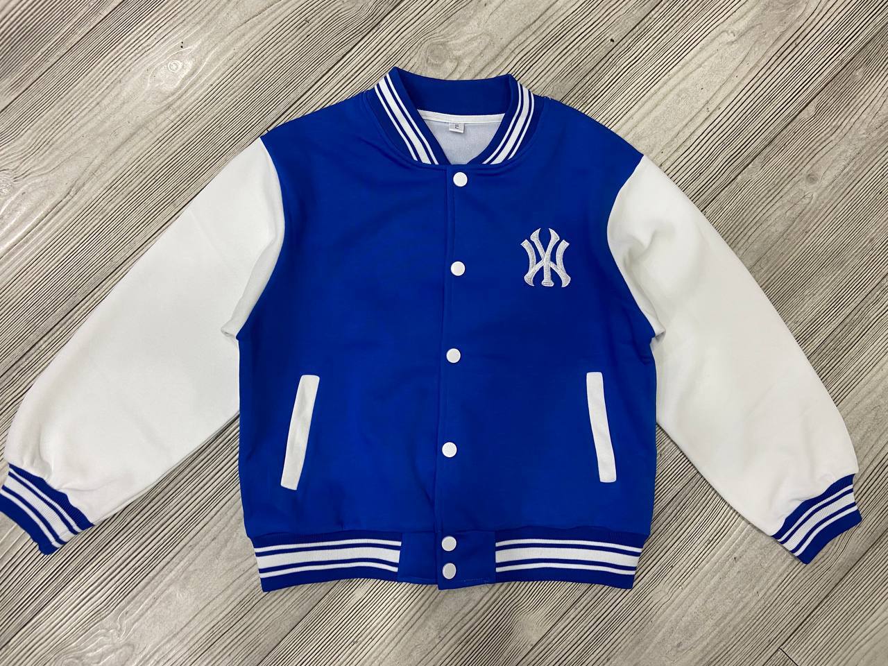 Бомбер LUX-94130 - это стильный бомбер в спортивном стиле. Основной цвет изделия синий, рукава выполнены в белом цвете. Бомбер украшен вышивкой на груди и белыми полосками на воротнике, манжетах и поясе.