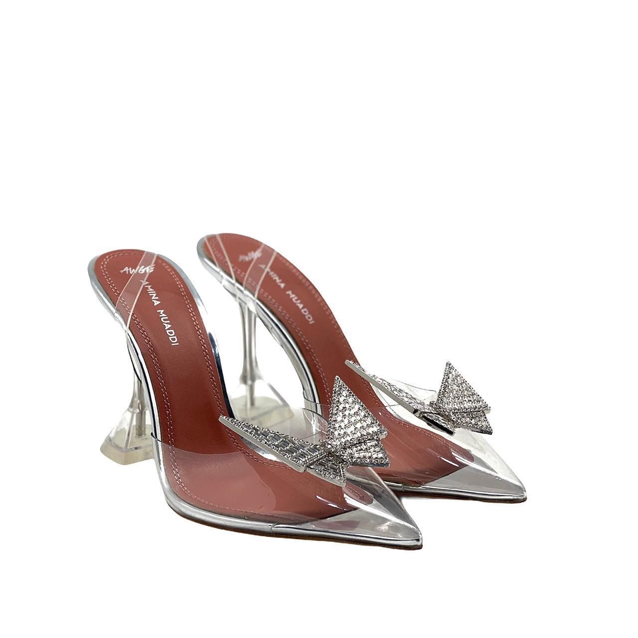 Эти элегантные прозрачные босоножки на шпильке от Amina Muaddi, артикул LUX-43908, станут эффектным дополнением к вечернему или праздничному образу. Дизайн модели отличается изящным острым мысом и украшен сверкающим бантом из кристаллов, добавляющим гламура. Устойчивый скульптурный каблук и прозрачные вставки обеспечивают комфорт и визуальную легкость.
