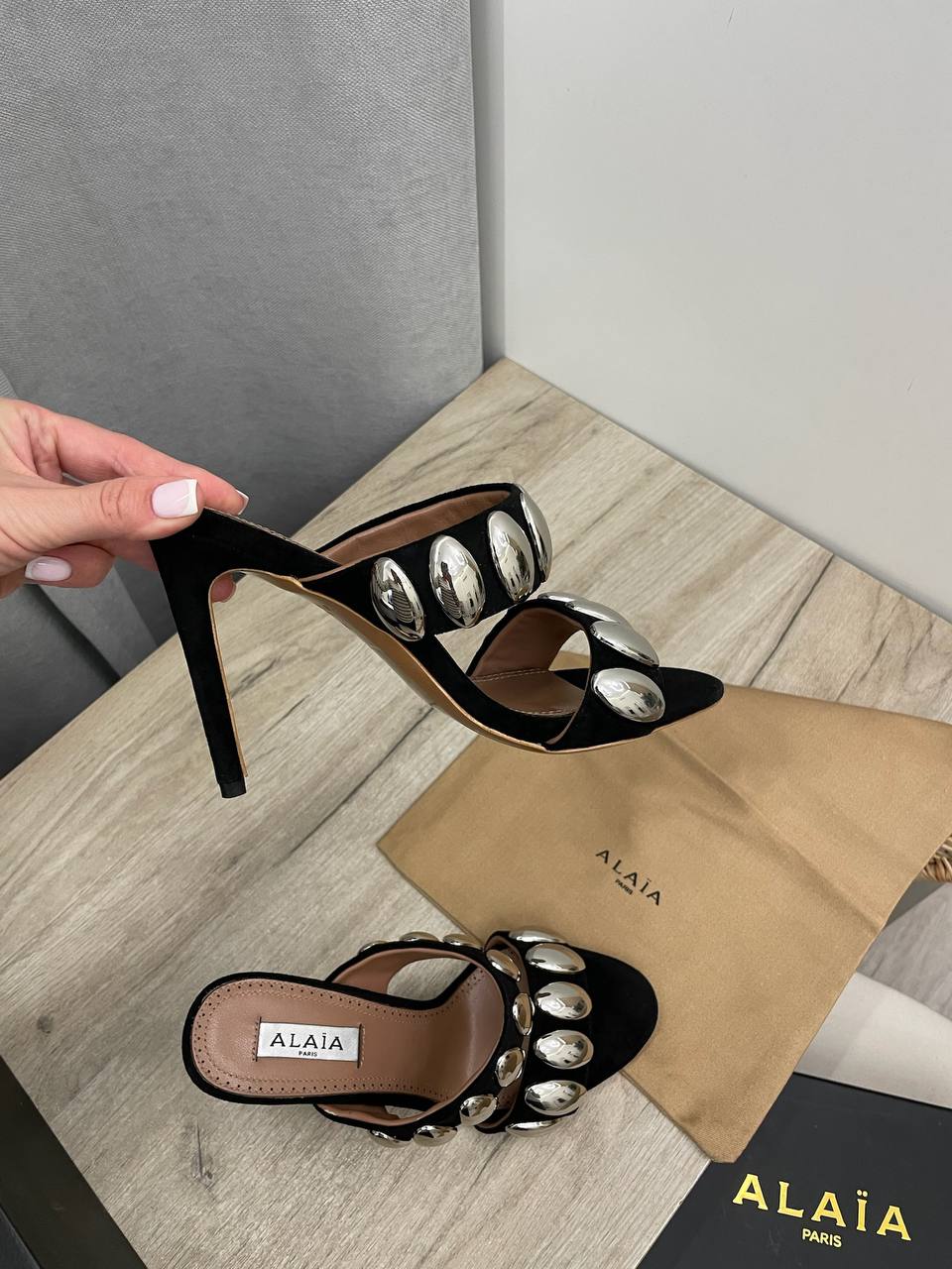 Босоножки Alaia LUX-104920 – это элегантная модель с выразительным дизайном. Они выполнены в черном цвете, что делает их универсальными для различных образов. Декоративные элементы добавляют шик.