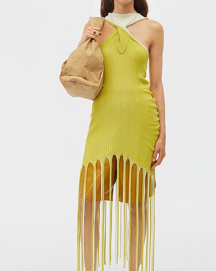 Это двухстороннее платье Bottega Veneta LUX-40550, выполненное в авангардном стиле, отличается оригинальным дизайном с драпировкой на лифе и эффектной бахромой по низу. Яркий салатовый цвет и фактурная вязка придают ему современный вид, а возможность носить его с обеих сторон делает его универсальным элементом гардероба. Это платье идеально подходит для создания смелых вечерних и коктейльных образов, подчеркивая индивидуальность и чувство стиля.