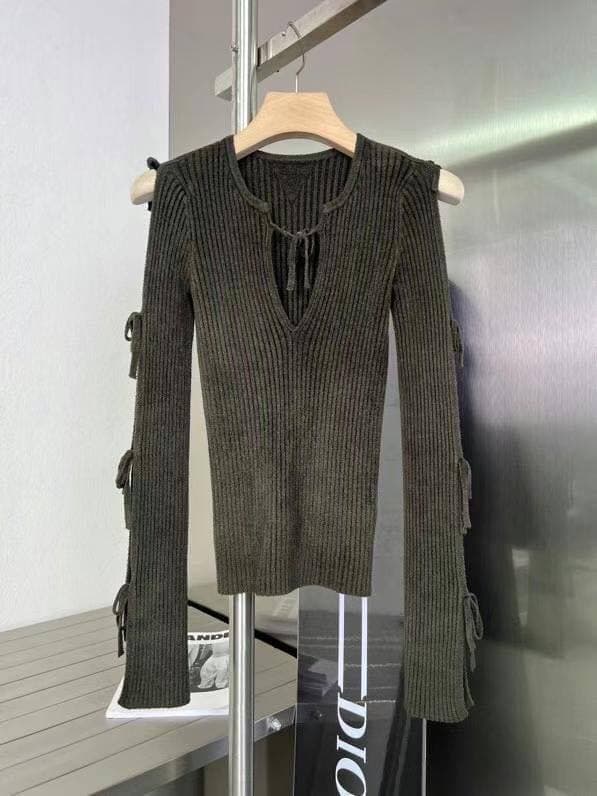 Эта кофта Bottega Veneta LUX-60373 выполнена в стиле casual chic, сочетая в себе элегантность и современный дизайн. Приталенный силуэт и фактурная вязка подчеркивают достоинства фигуры, а оригинальные детали, такие как шнуровка на вырезе и декоративные завязки на рукавах, добавляют изысканности.