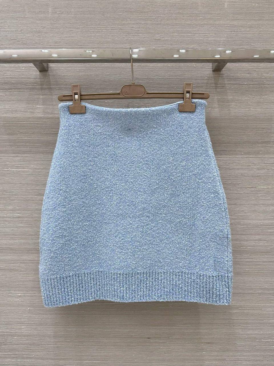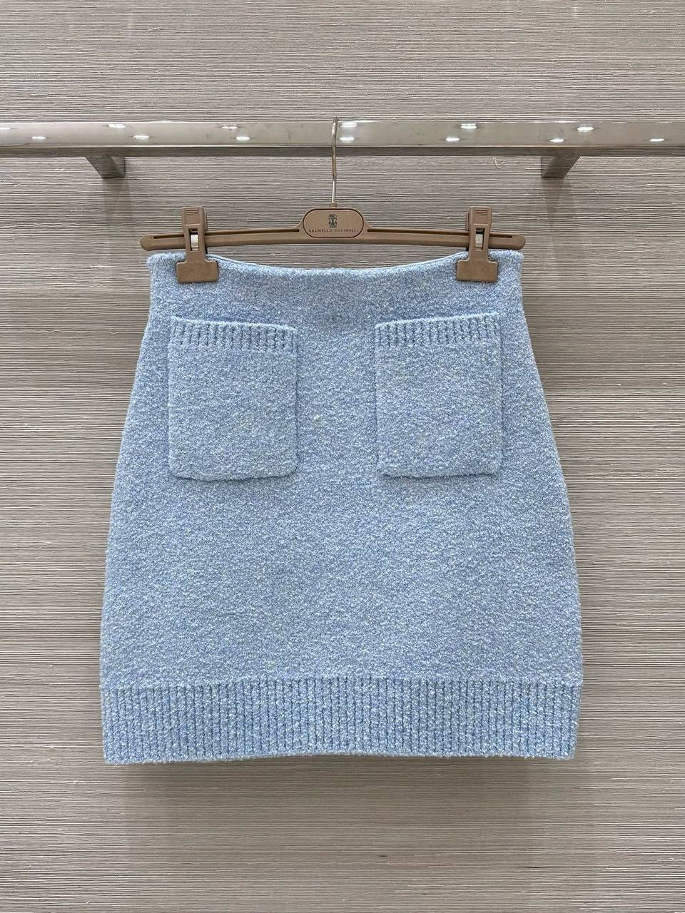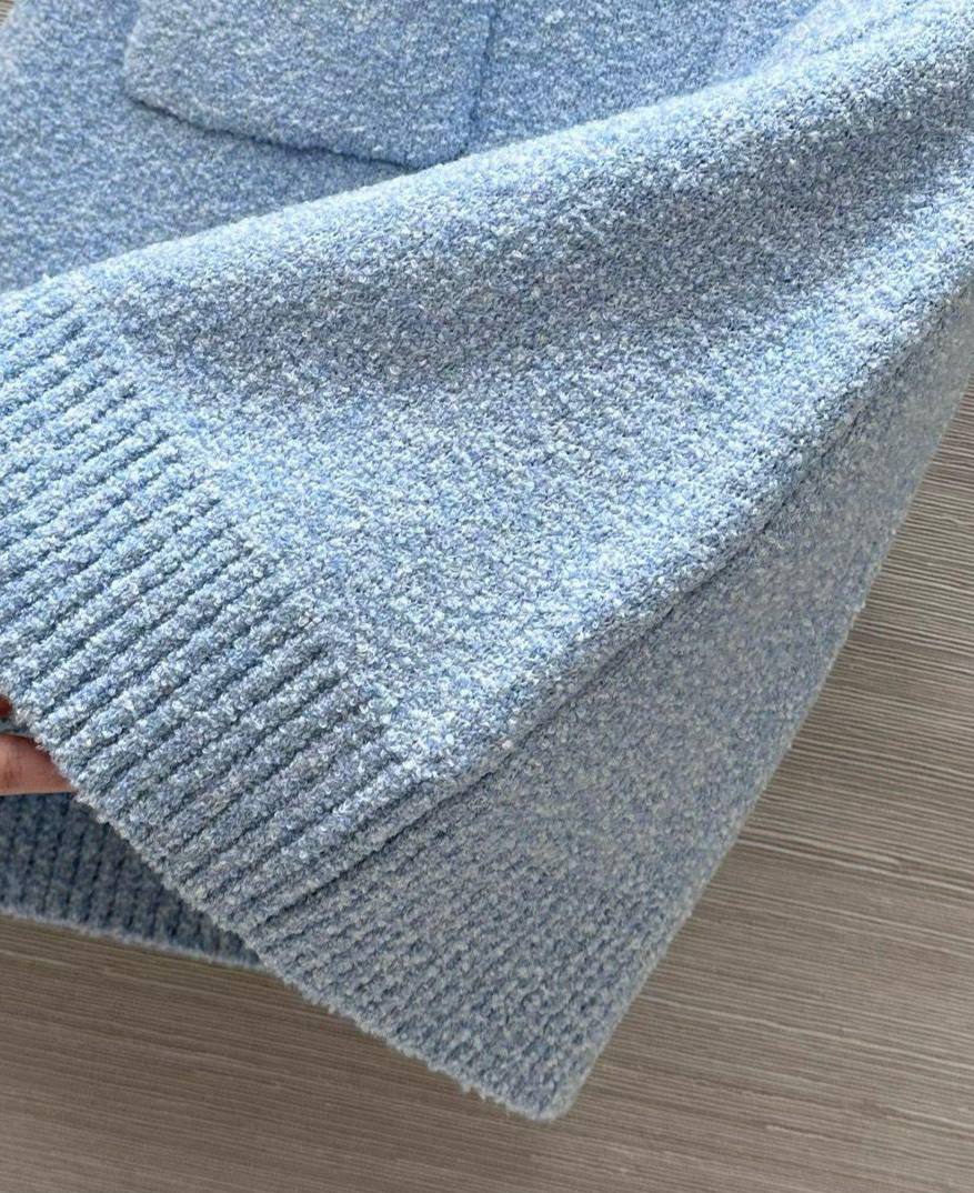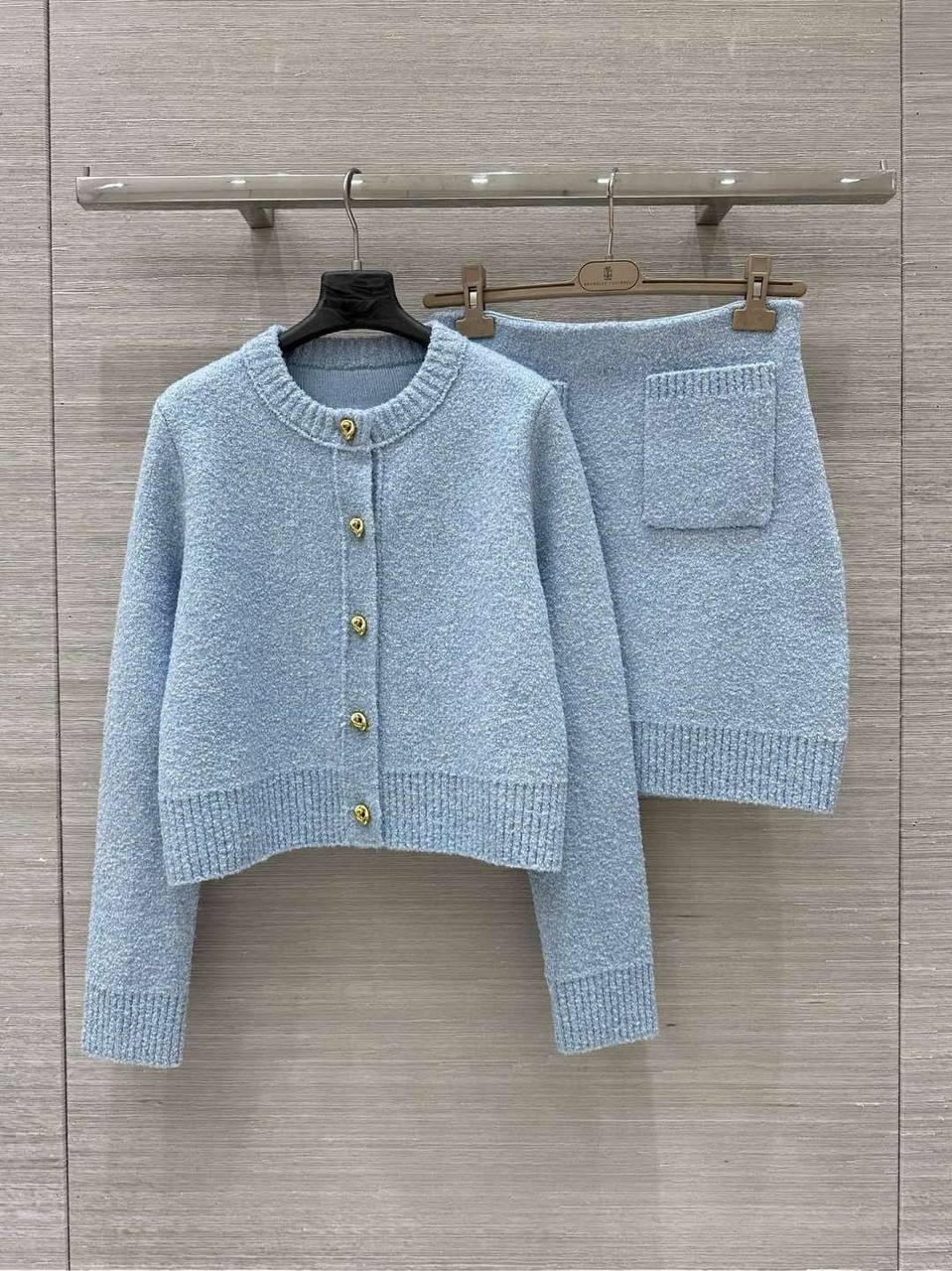 Костюм женский Bottega Veneta LUX-114664 представляет собой элегантный комплект в небесно-голубом цвете. Этот костюм состоит из укороченного кардигана на пуговицах и мини-юбки с одним накладным карманом. Текстура материала выглядит плотной, что предполагает его использование в прохладное время года.