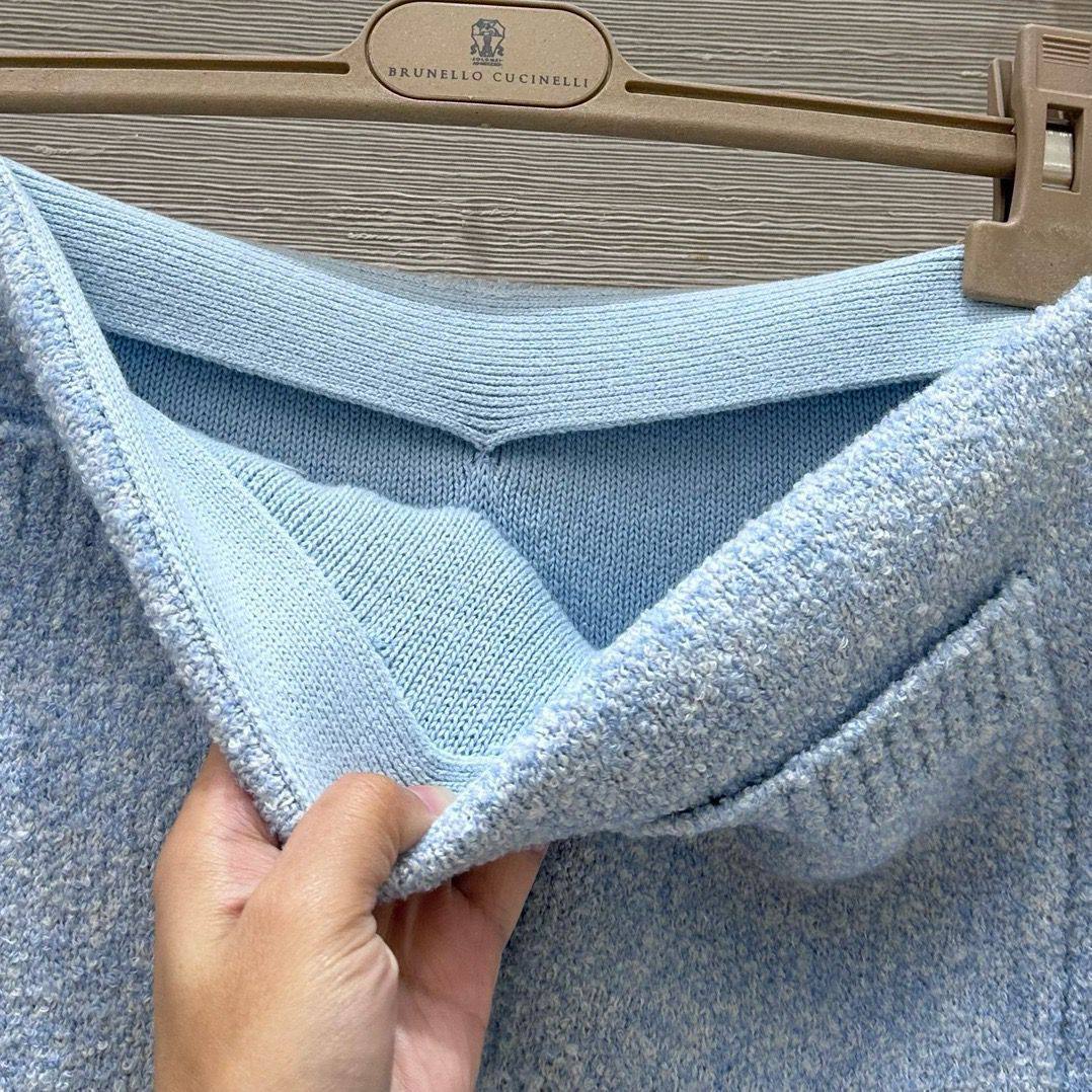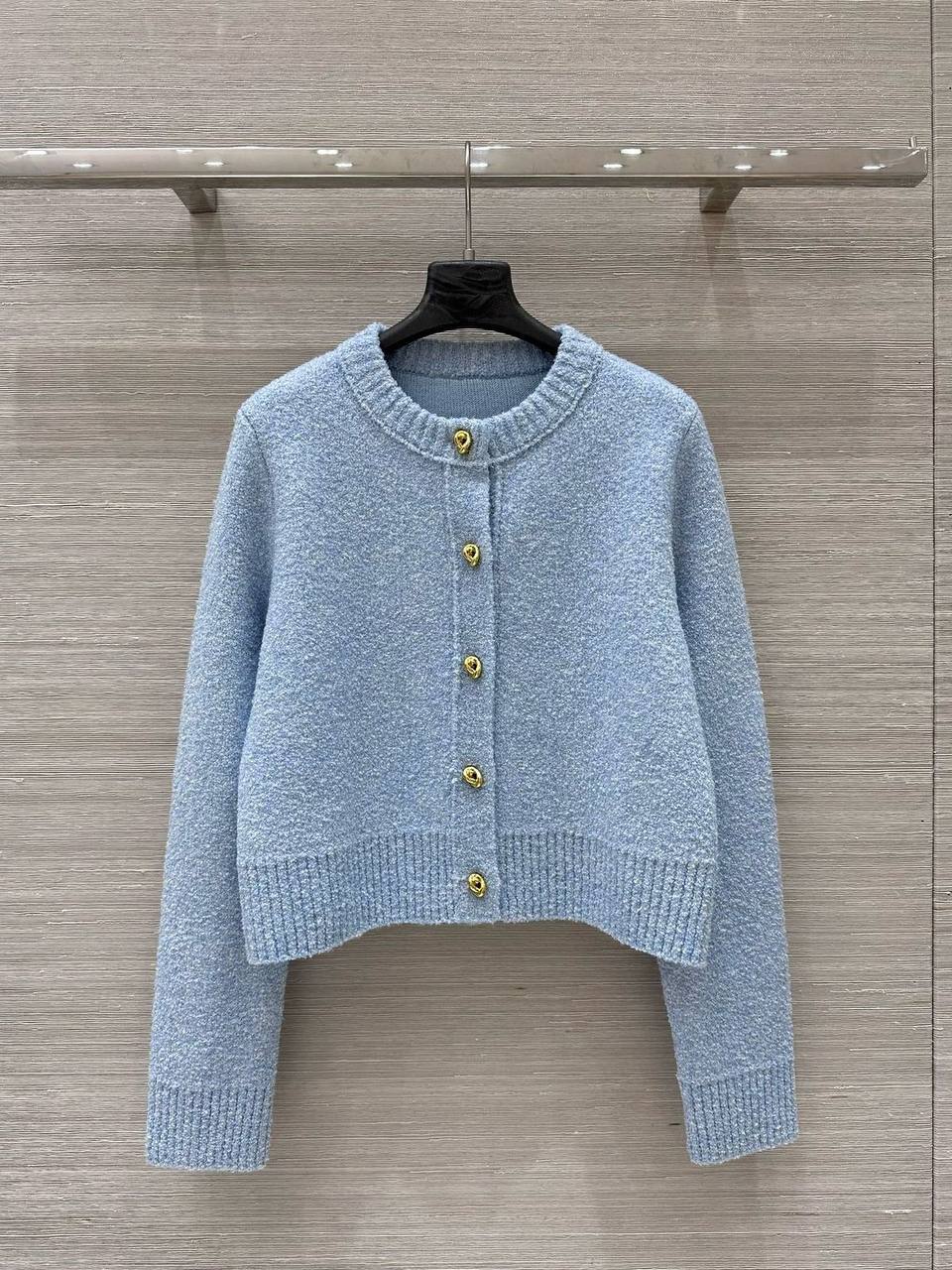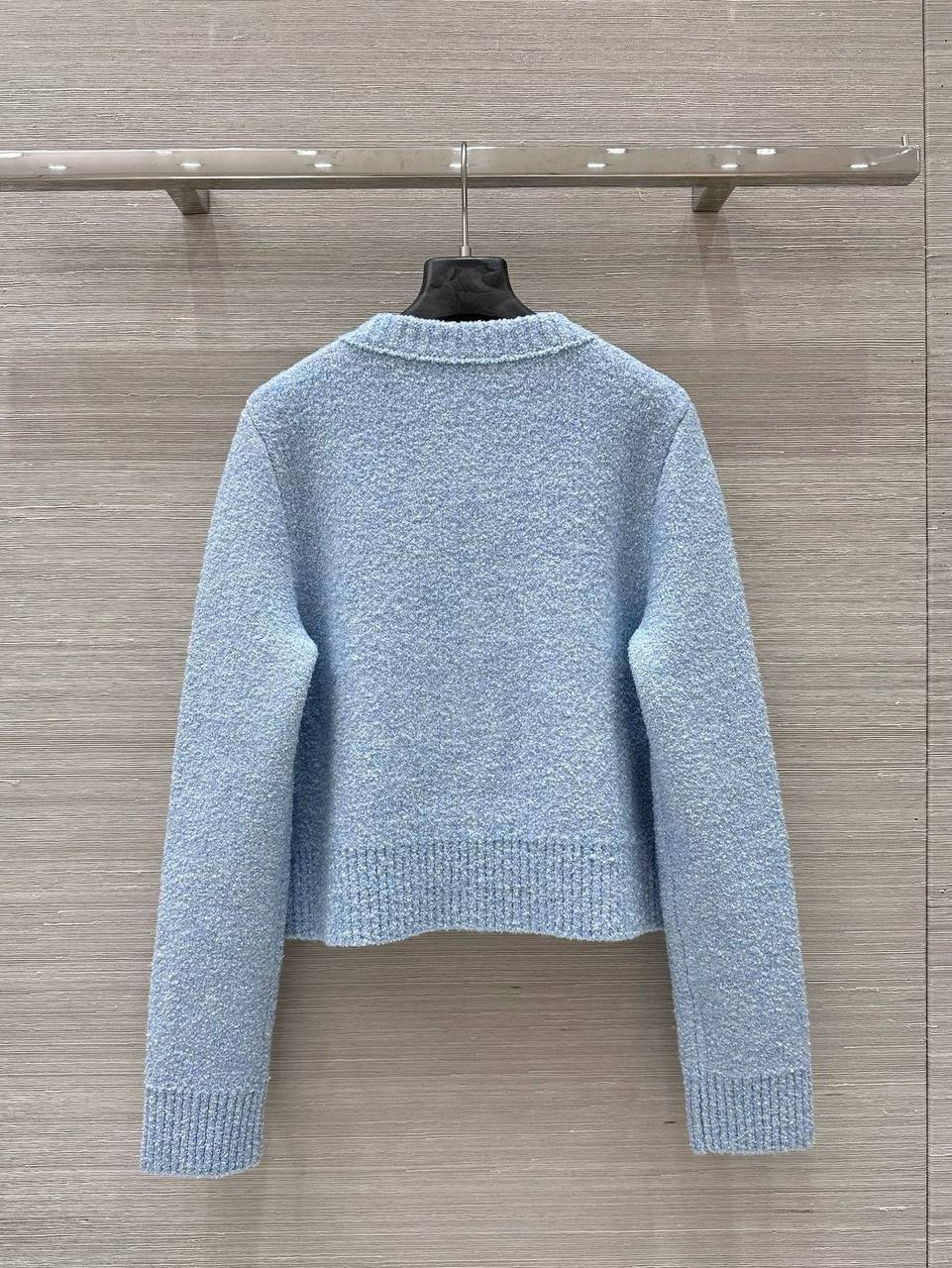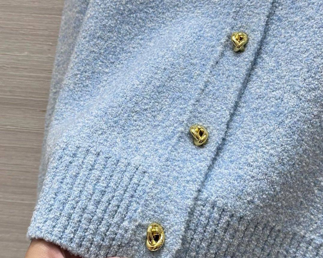 Костюм женский Bottega Veneta LUX-114664 представляет собой элегантный комплект в небесно-голубом цвете. Этот костюм состоит из укороченного кардигана на пуговицах и мини-юбки с одним накладным карманом. Текстура материала выглядит плотной, что предполагает его использование в прохладное время года.