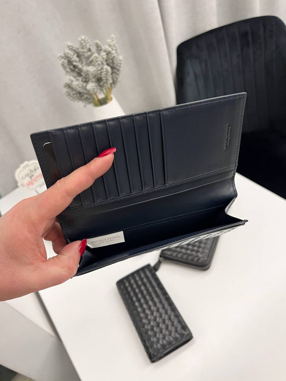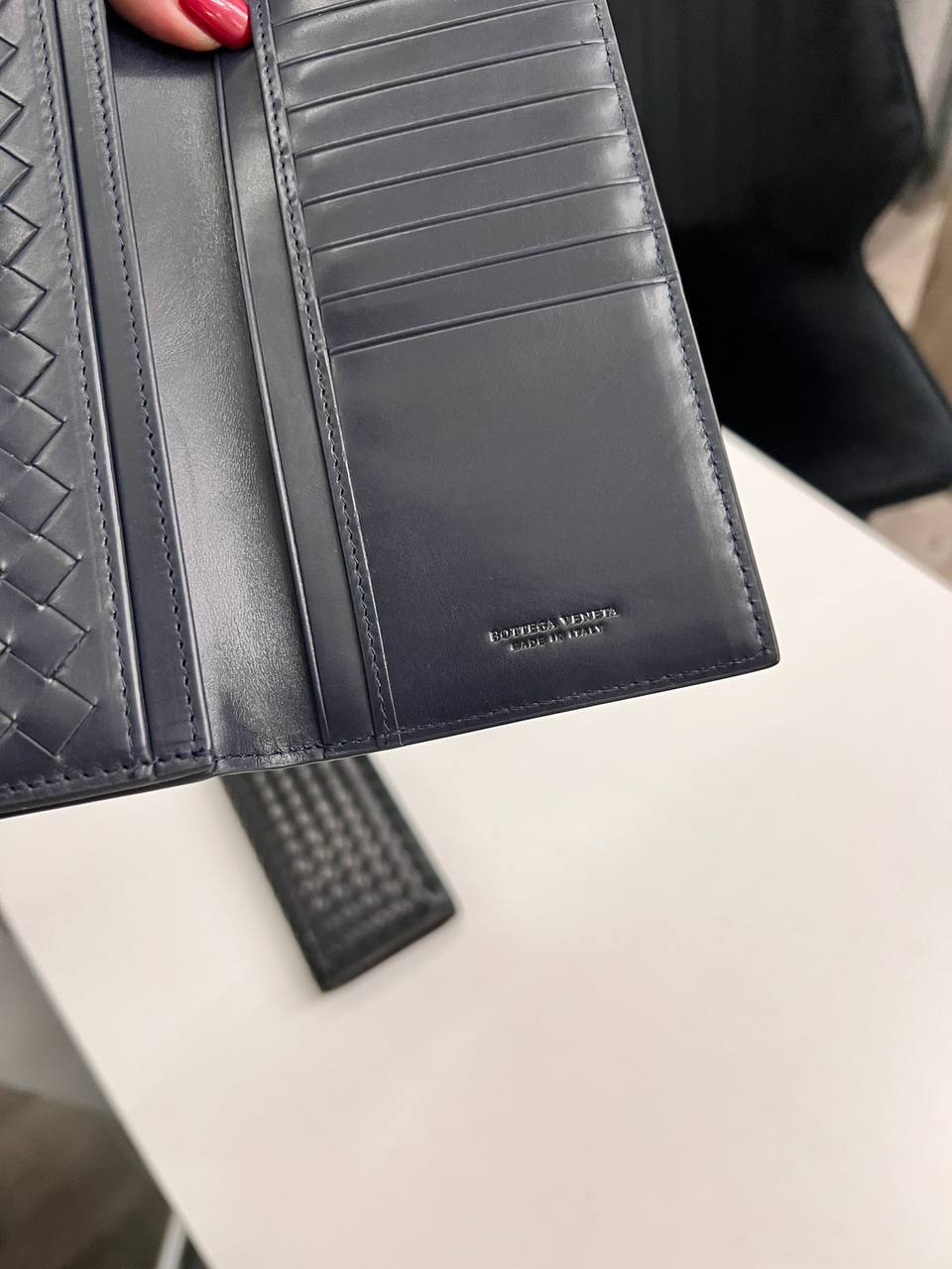 Купюрник Bottega Veneta LUX-115096 представляет собой элегантный аксессуар, выполненный в классическом стиле. Изделие темно-синего цвета имеет плетеную текстуру, что придает ему уникальный внешний вид. Купюрник предназначен для хранения купюр, карт и других необходимых мелочей.