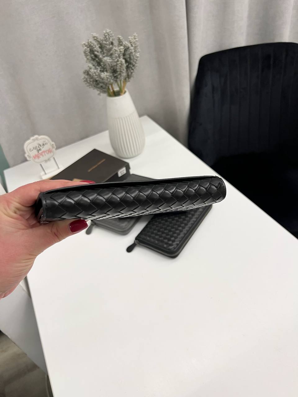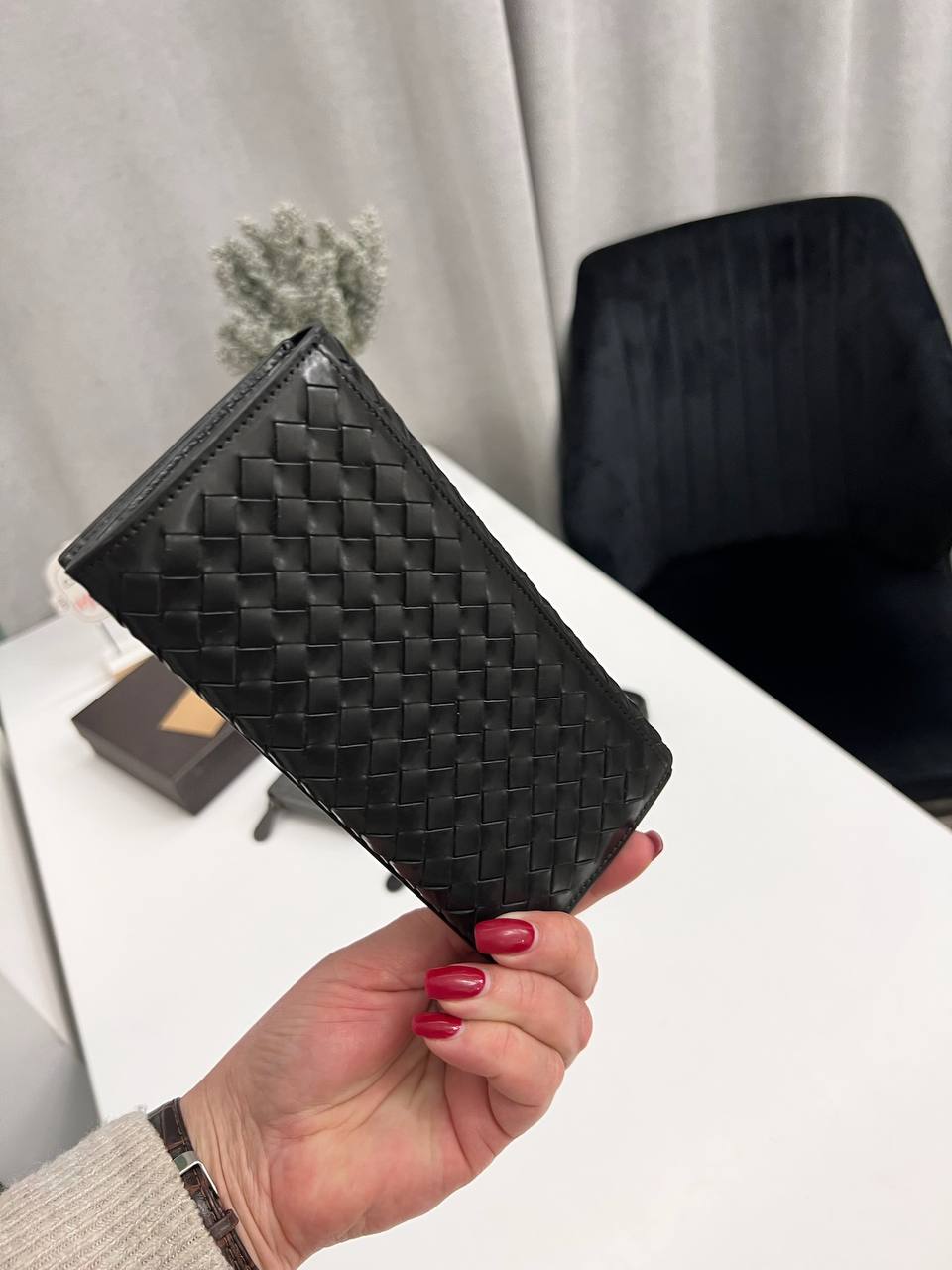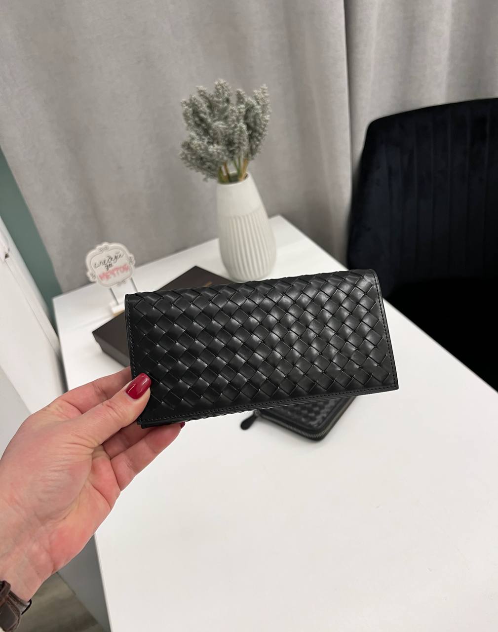 Купюрник Bottega Veneta LUX-115097 — это элегантный аксессуар, выполненный в классическом стиле. Чёрный цвет и плетеная текстура придают изделию изысканный вид, а его основное предназначение — хранение купюр и банковских карт.