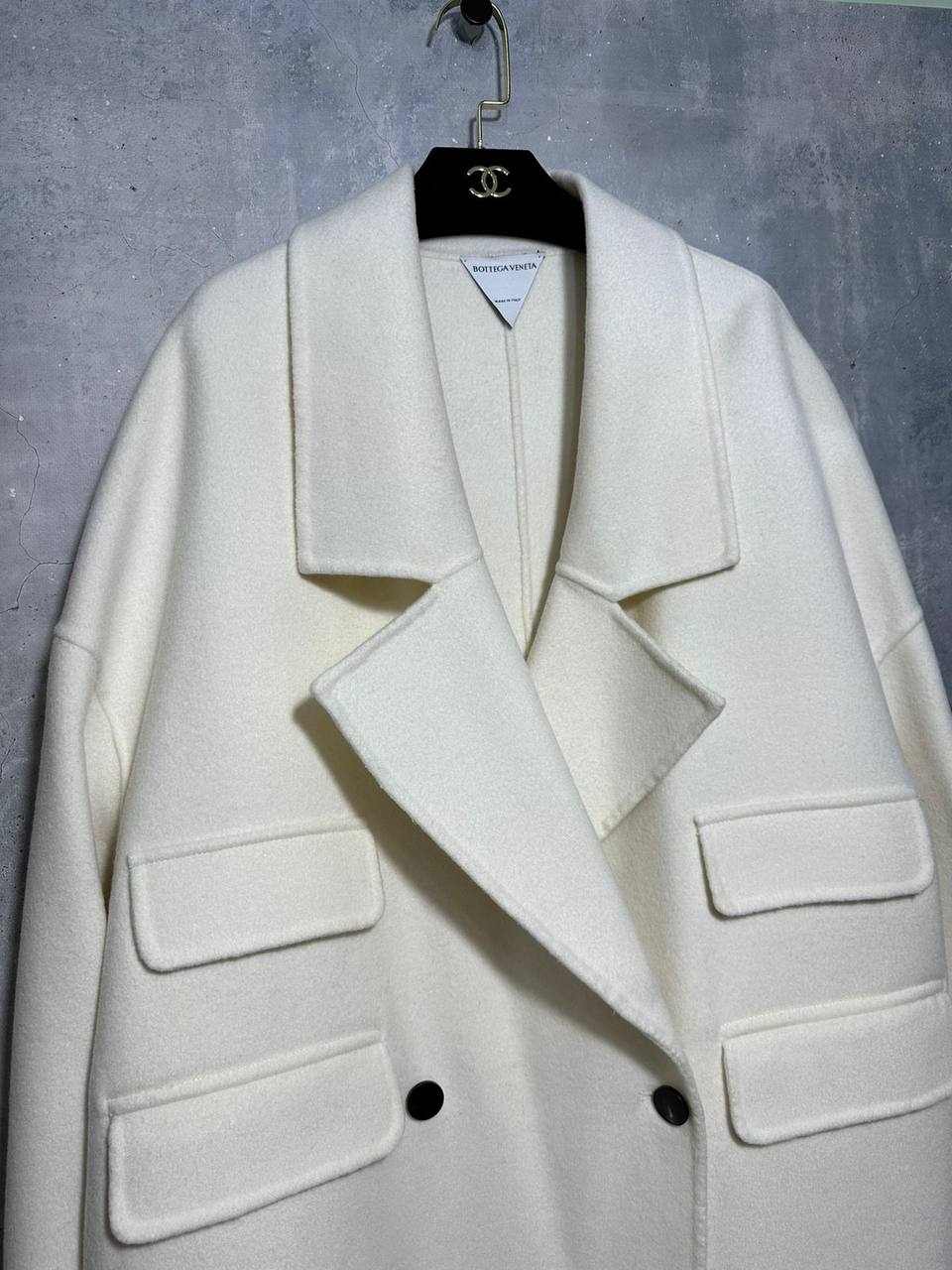 Пальто Bottega Veneta LUX-97501 – это элегантное пальто молочного цвета, выполненное в минималистичном стиле. Пальто имеет прямой крой, длинные рукава и классический отложной воротник. Декорировано накладными карманами.