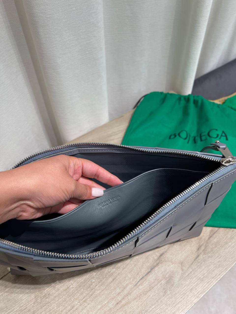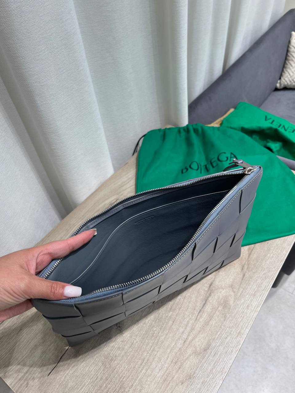 Папка Bottega Veneta выполнена в фирменном стиле плетения intrecciato, что делает ее узнаваемой. Это элегантный и функциональный аксессуар для деловых встреч и повседневного использования.